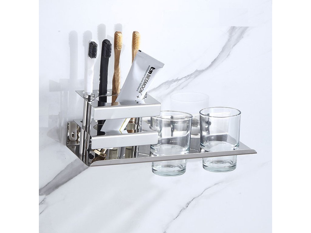 Posiada uchwyt na dwie szklanki, które są dołączone do zestawu . Stojak na szczoteczki do zębów, pastę do zębów lub inne kosmetyki pozwoli Ci zachować porządek w jednym miejscu.