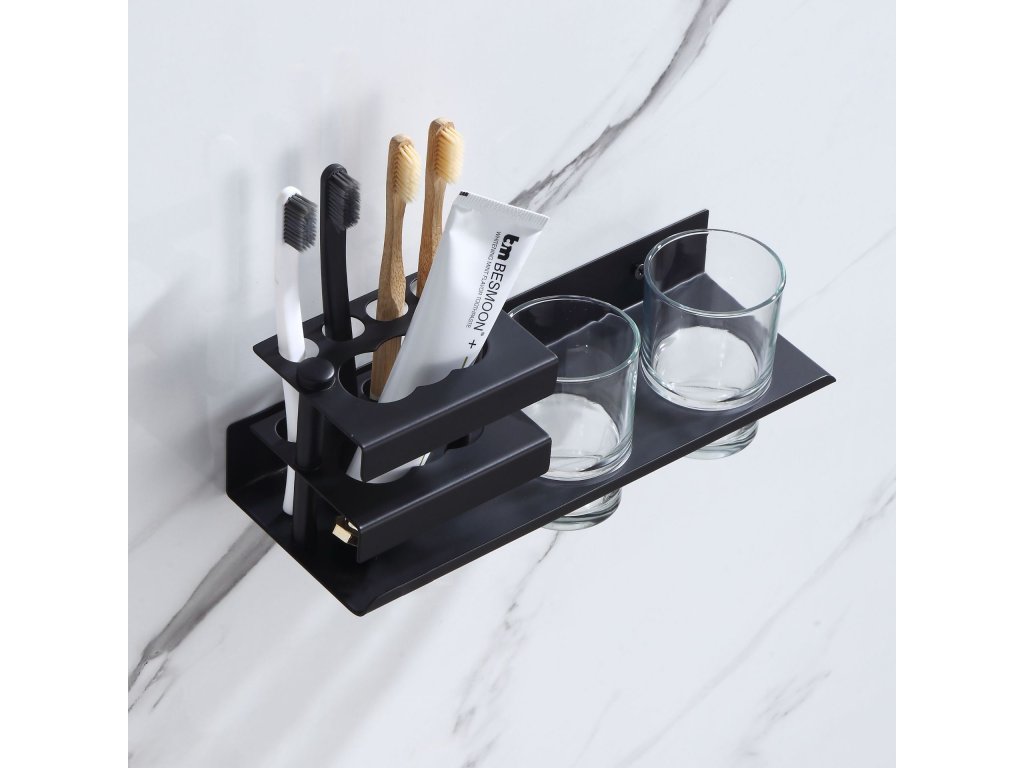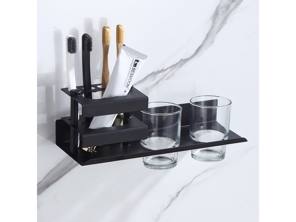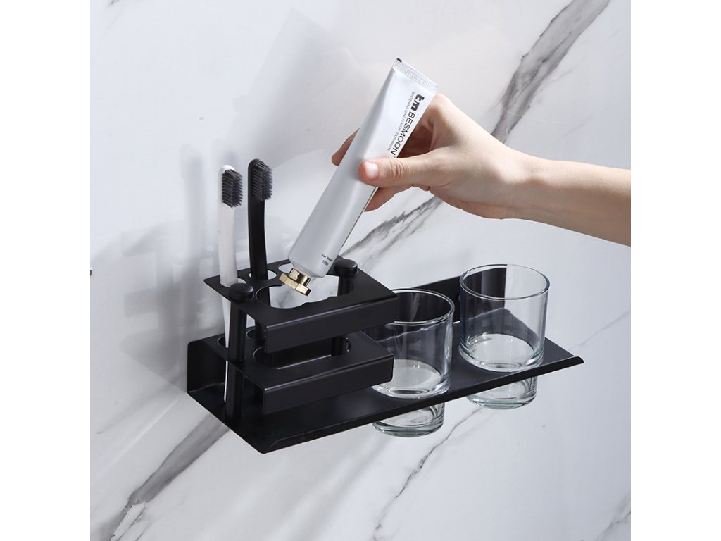 Posiada uchwyt na dwie szklanki, które są dołączone do zestawu . Stojak na szczoteczki do zębów, pastę do zębów lub inne kosmetyki pozwoli Ci zachować porządek w jednym miejscu.