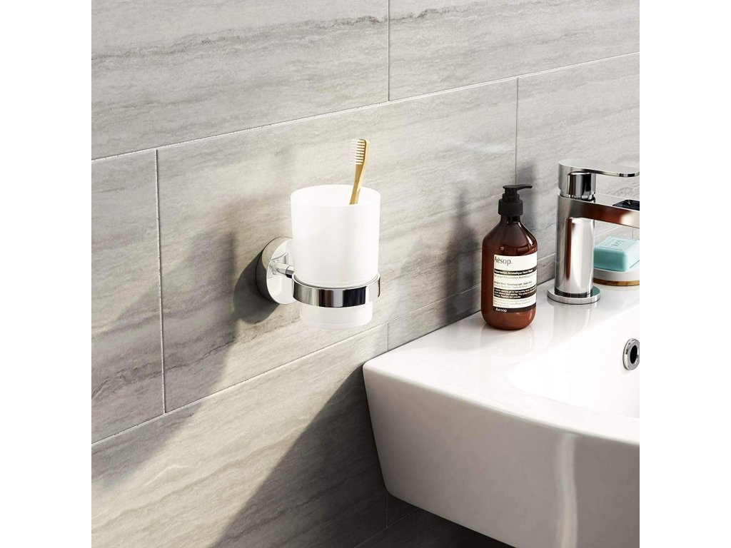 - Uchwyty na szklanki montowane na ścianie – możliwość przechowywania pary lub pojedynczych szklanek, idealne do uporządkowania artykułów higienicznych.