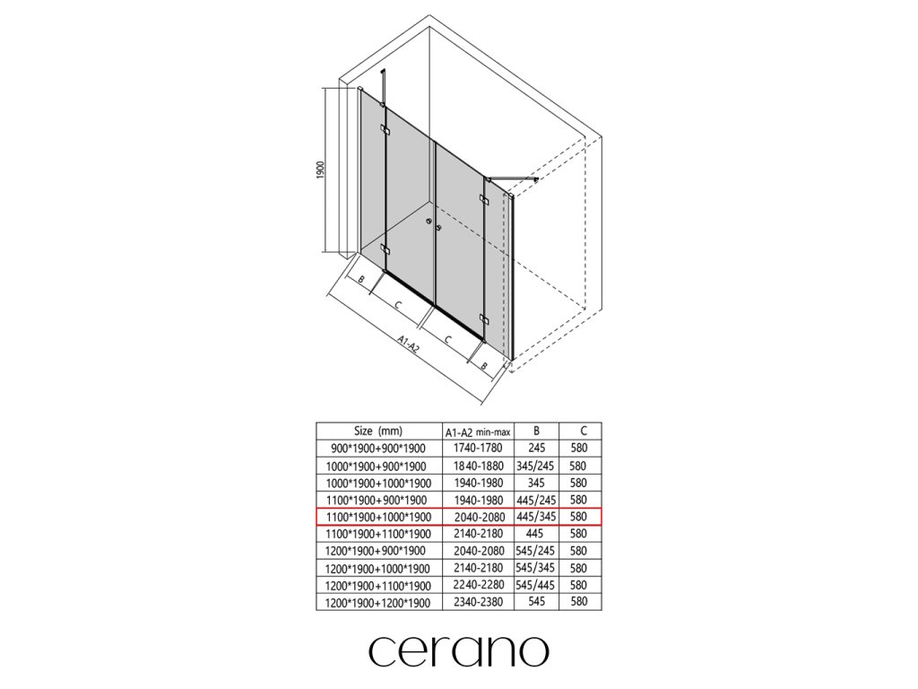 CERANO - drzwi prysznicowe 2-zawiasowe Marino L/P - 6 mm - chrom, szkło przezroczyste - 208(109+99)x190 cm