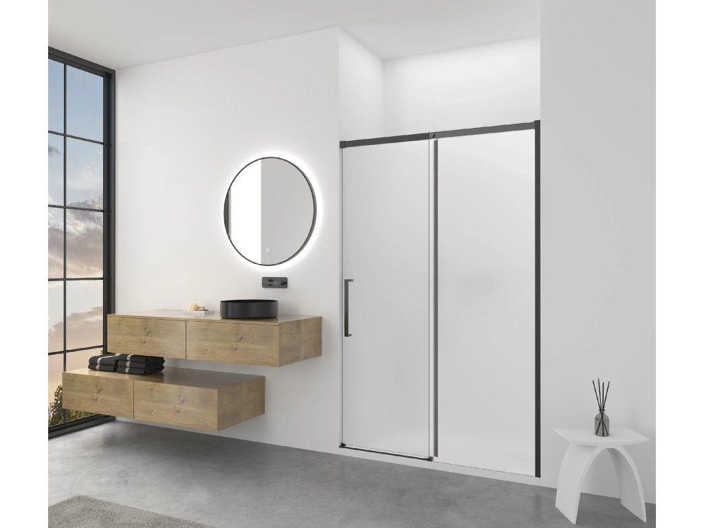CERANO - Drzwi prysznicowe przesuwne Lantono - prawe - 8 mm - Soft-Close - matowa czerń, szkło mrożone - 150x195 cm