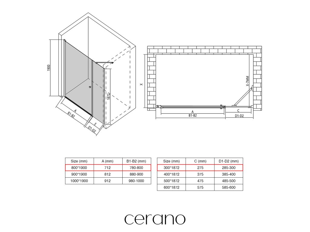 W ramach tej serii oferujemy szeroki wybór wymiarów, aby sprostać zróżnicowanym potrzebom naszych klientów. Wszystkie kabiny prysznicowe, drzwi i parawany CERANO są w pełni kompatybilne z brodzikami CERANO o tych samych wymiarach, co zapewnia bezproblemowy montaż i idealną koordynację.
