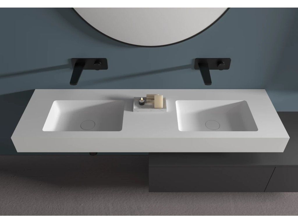 CERANO - Podwójna umywalka z lanego marmuru Geminia - ścienna - biały mat - 133x45 cm