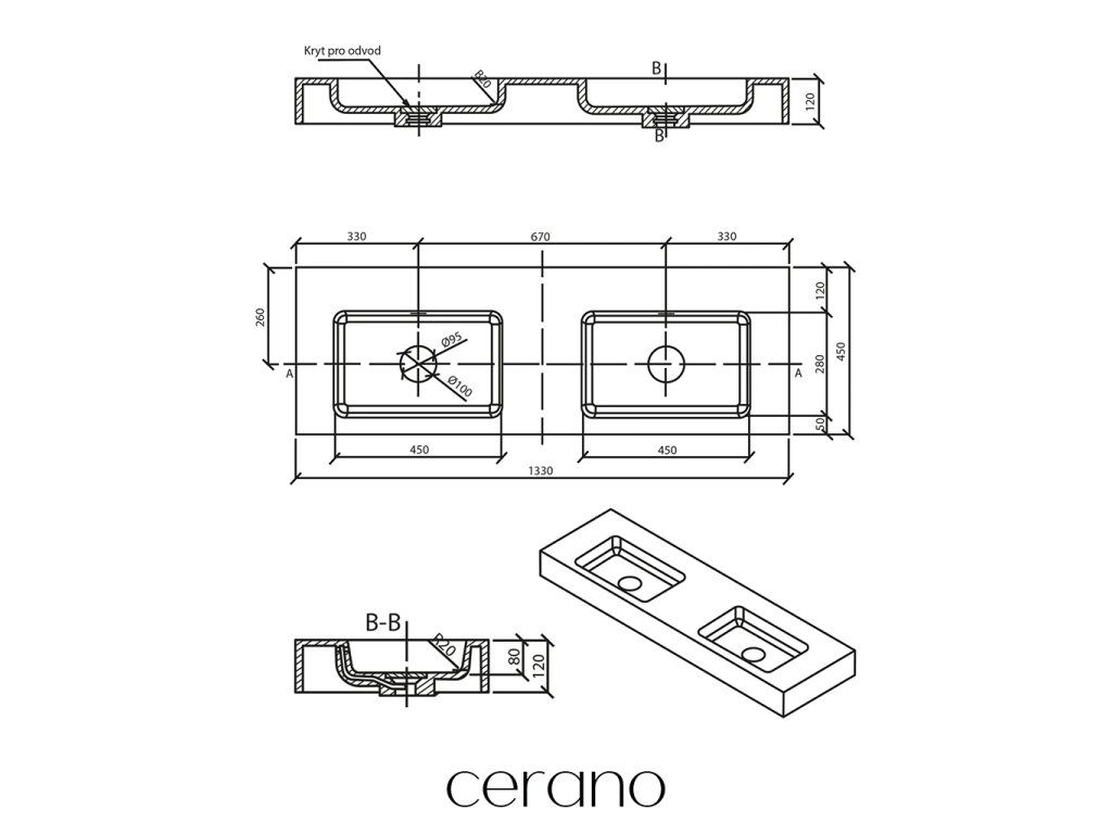 CERANO - Podwójna umywalka z lanego marmuru Geminia - ścienna - czarny mat - 133x45 cm