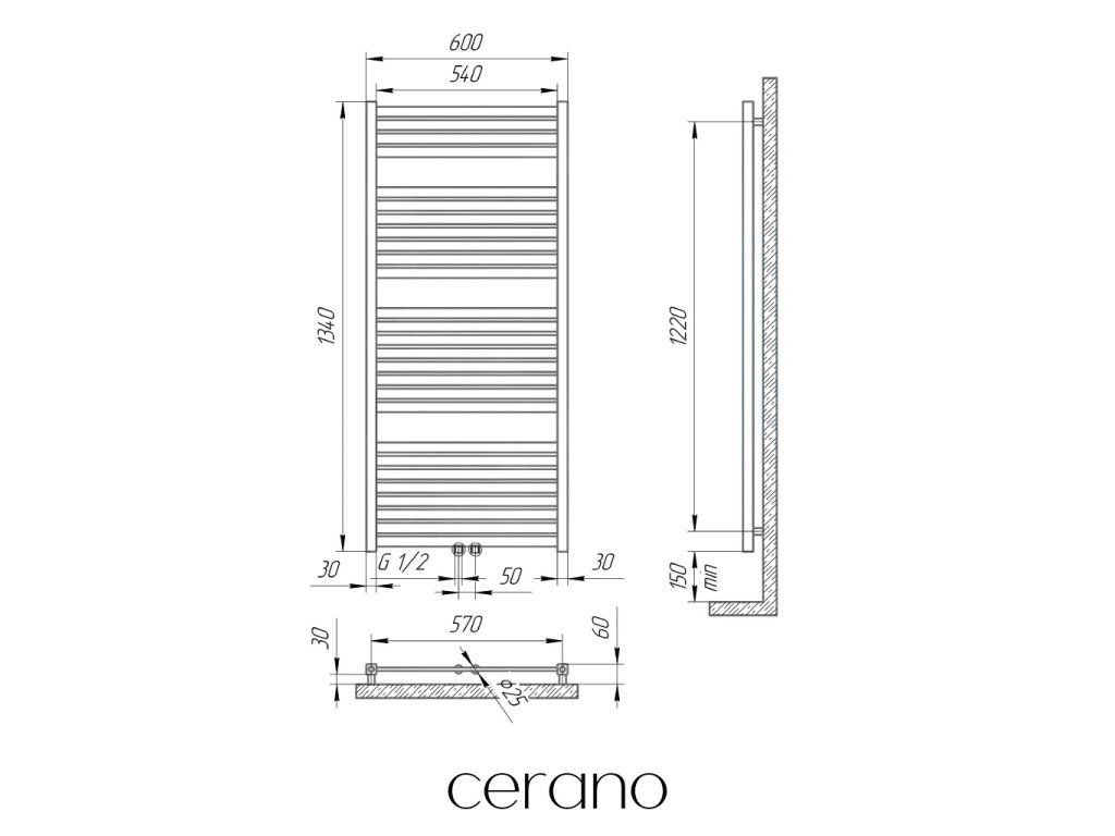CERANO - Grzejnik łazienkowy Vincenzo - podłączenie centralne 50mm/boczne - 600W - matowy czarny - 1340x600 mm