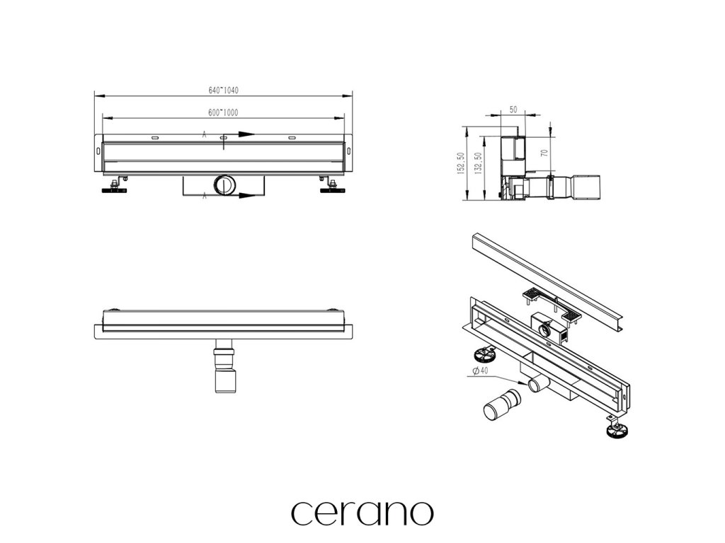 CERANO - Odpływ prysznicowy do ściany, syfon - stal nierdzewna - DN40 - mat czarny - 94 cm