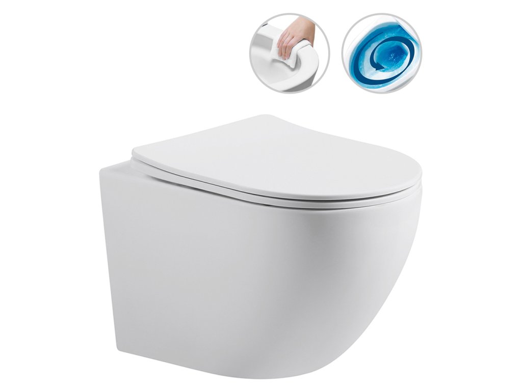 CERANO - Kompletny zestaw WC z modułem spłuczki sanitarnej - biały mat + podwieszana miska WC Cesso, Vortex Rimless + deska Slim/UF - biały mat - 49x36 cm