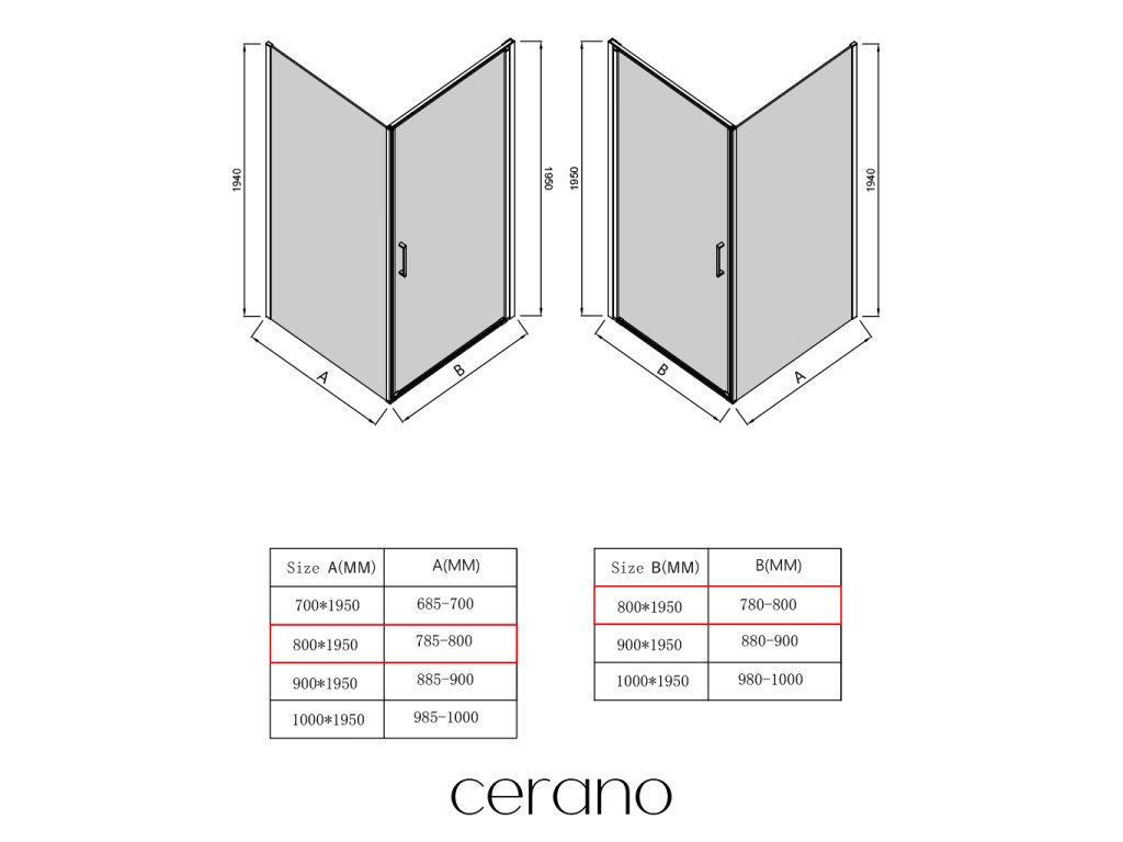 W ramach tej serii oferujemy szeroki wybór wymiarów, aby sprostać zróżnicowanym potrzebom naszych klientów. Wszystkie kabiny prysznicowe, drzwi i parawany CERANO są w pełni kompatybilne z brodzikami CERANO o tych samych wymiarach, co zapewnia bezproblemowy montaż i idealne dopasowanie. Ponadto kabinę można elastycznie zamontować – na pasującym brodziku lub bezpośrednio na podłodze, w zależności od preferencji i wyposażenia łazienki.