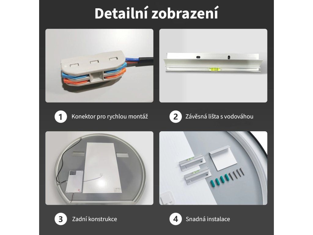 Lustra posiadają przycisk dotykowy, który włącza i wyłącza światło. Można je również podłączyć do klasycznego włącznika ściennego, ale nawet jeśli wyłączysz światło włącznikiem, po ponownym włączeniu musisz ponownie włączyć światło bezpośrednio na lustrze za pomocą przycisku dotykowego. Lustro jest gotowe do bezpośredniego podłączenia do sieci elektrycznej, ale można je również podłączyć do gniazdka za pomocą adaptera (brak w zestawie). Dla bezpiecznego montażu zalecamy kontakt z wykwalifikowanym elektrykiem.