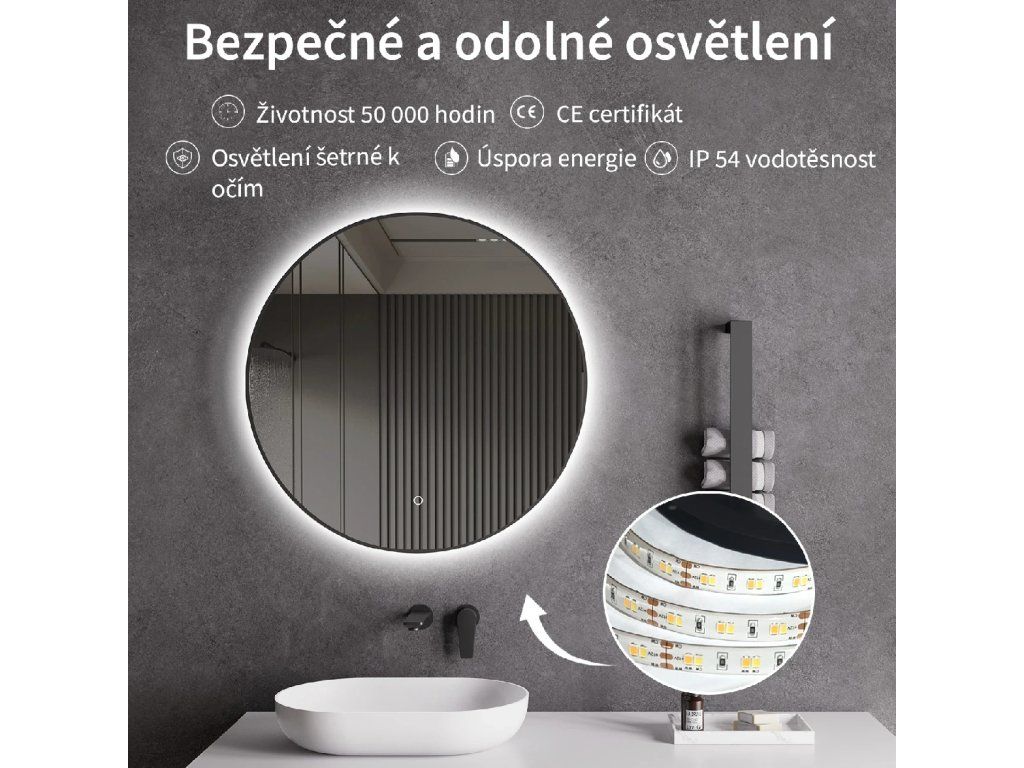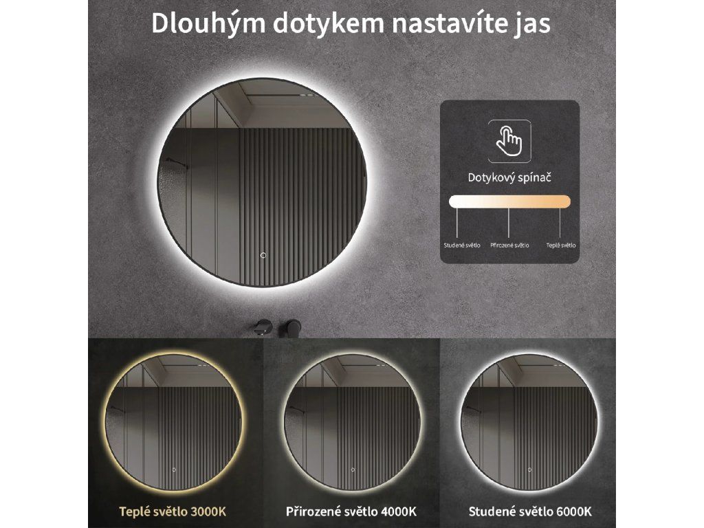 Lustro wyposażone jest w oświetlenie LED z regulowaną barwą światła – od 3000 K (ciepłe) do 6000 K (neutralne). Kolory można łatwo zmieniać za pomocą dotykowego przycisku na powierzchni lustra. Zapewnia ono intensywne i jasne światło do precyzyjnej pielęgnacji, a także przyjemne, delikatne oświetlenie sprzyjające relaksowi. Dzięki szerokiej gamie temperatur barwowych z łatwością dostosujesz nastrój do swoich aktualnych potrzeb.