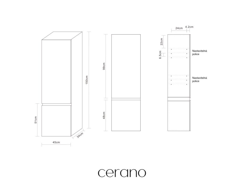 Nowoczesne i funkcjonalne wysokie szafki łazienkowe marki Cerano to idealny wybór! Mają wysokość 150 cm i szerokość 45 cm, dzięki czemu oferują mnóstwo miejsca do przechowywania akcesoriów łazienkowych, a jednocześnie znacznie oszczędzają miejsce w łazience.