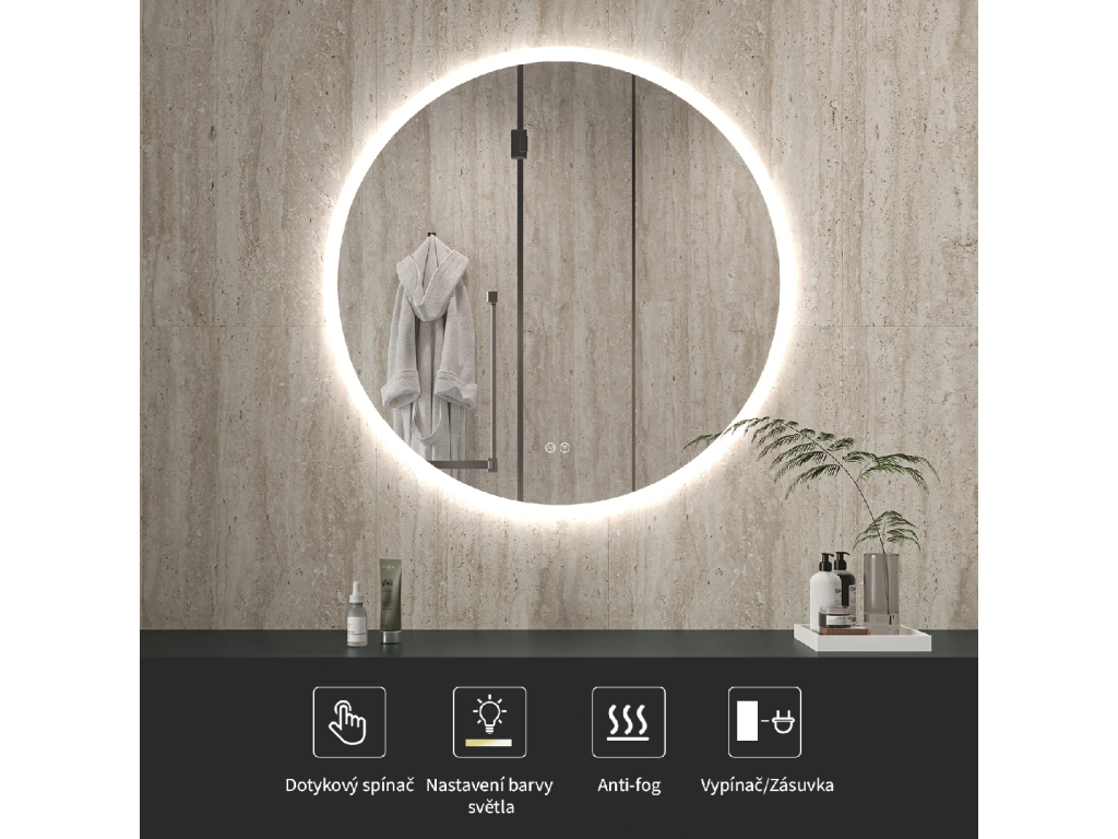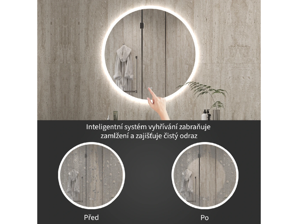Lustro wyposażone jest w oświetlenie LED z regulowaną barwą światła – od 3000 K (ciepłe) do 6000 K (neutralne). Kolory można łatwo zmieniać za pomocą dotykowego przycisku na powierzchni lustra. Zapewnia ono intensywne i jasne światło do precyzyjnej pielęgnacji, a także przyjemne, delikatne oświetlenie sprzyjające relaksowi. Dzięki szerokiej gamie temperatur barwowych z łatwością dostosujesz nastrój do swoich aktualnych potrzeb.