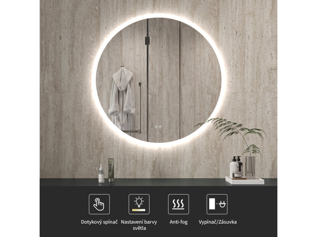 Lustro wyposażone jest w oświetlenie LED z regulowaną barwą światła – od 3000 K (ciepłe) do 6000 K (neutralne). Kolory można łatwo zmieniać za pomocą dotykowego przycisku na powierzchni lustra. Zapewnia ono intensywne i jasne światło do precyzyjnej pielęgnacji, a także przyjemne, delikatne oświetlenie sprzyjające relaksowi. Dzięki szerokiej gamie temperatur barwowych z łatwością dostosujesz nastrój do swoich aktualnych potrzeb.