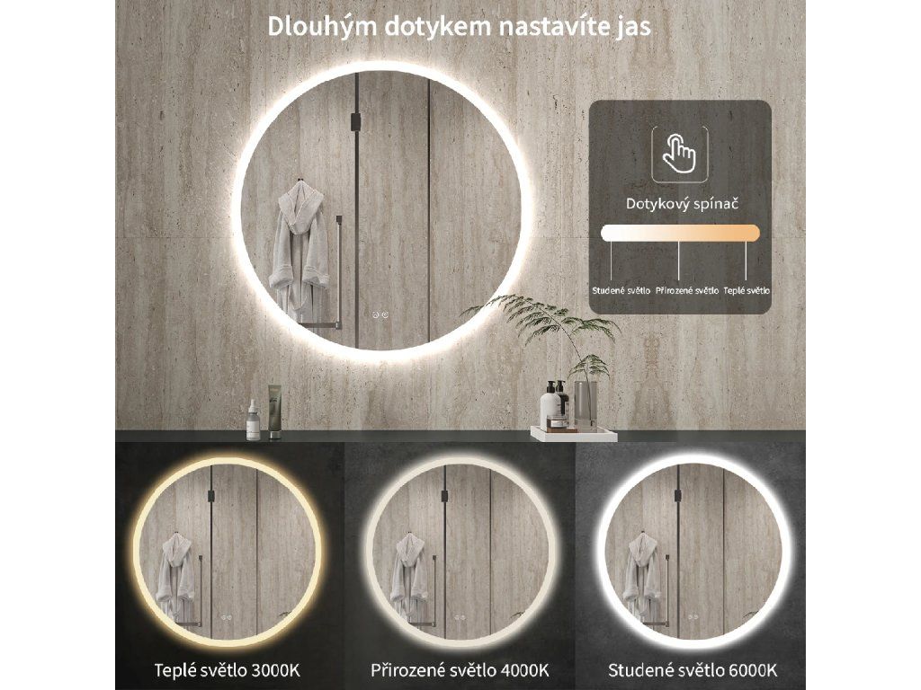 Lustro wyposażone jest w oświetlenie LED z regulowaną barwą światła – od 3000 K (ciepłe) do 6000 K (neutralne). Kolory można łatwo zmieniać za pomocą dotykowego przycisku na powierzchni lustra. Zapewnia ono intensywne i jasne światło do precyzyjnej pielęgnacji, a także przyjemne, delikatne oświetlenie sprzyjające relaksowi. Dzięki szerokiej gamie temperatur barwowych z łatwością dostosujesz nastrój do swoich aktualnych potrzeb.