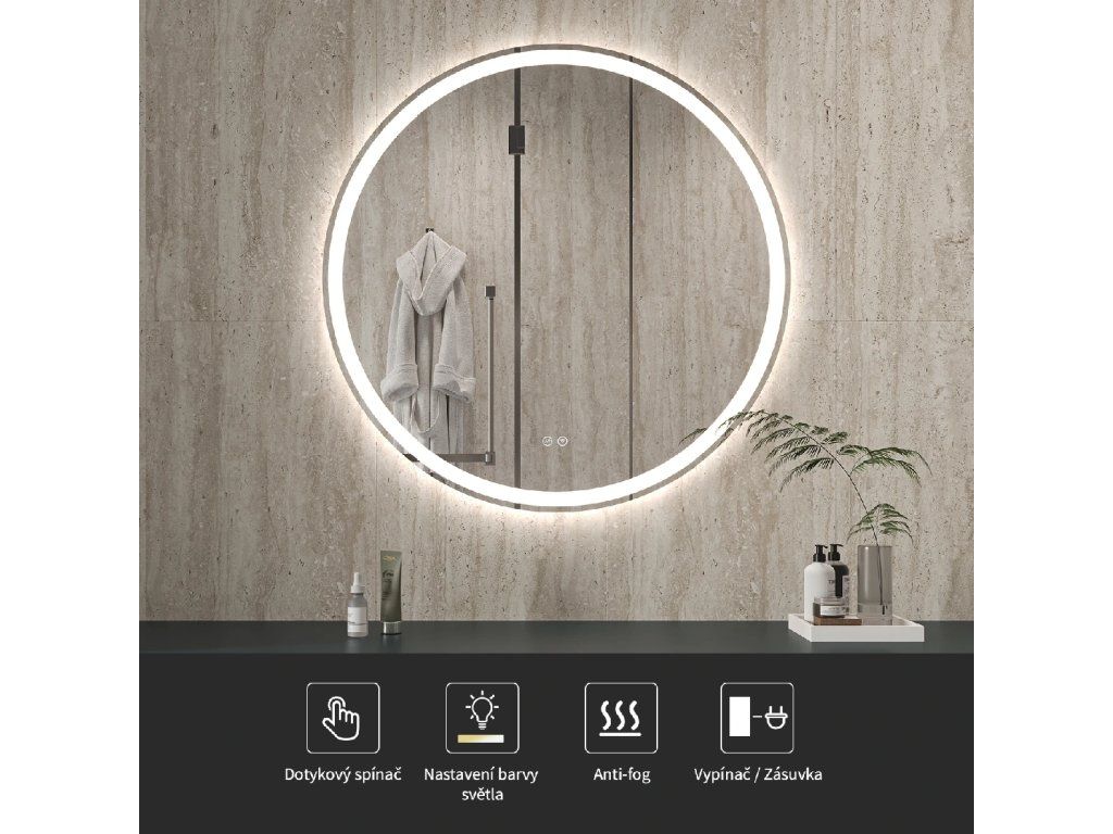 Lustro wyposażone jest w oświetlenie LED z regulowaną barwą światła – od 3000 K (ciepłe) do 6000 K (neutralne). Kolory można łatwo zmieniać za pomocą dotykowego przycisku na powierzchni lustra. Zapewnia ono intensywne i jasne światło do precyzyjnej pielęgnacji, a także przyjemne, delikatne oświetlenie sprzyjające relaksowi. Dzięki szerokiej gamie temperatur barwowych z łatwością dostosujesz nastrój do swoich aktualnych potrzeb.