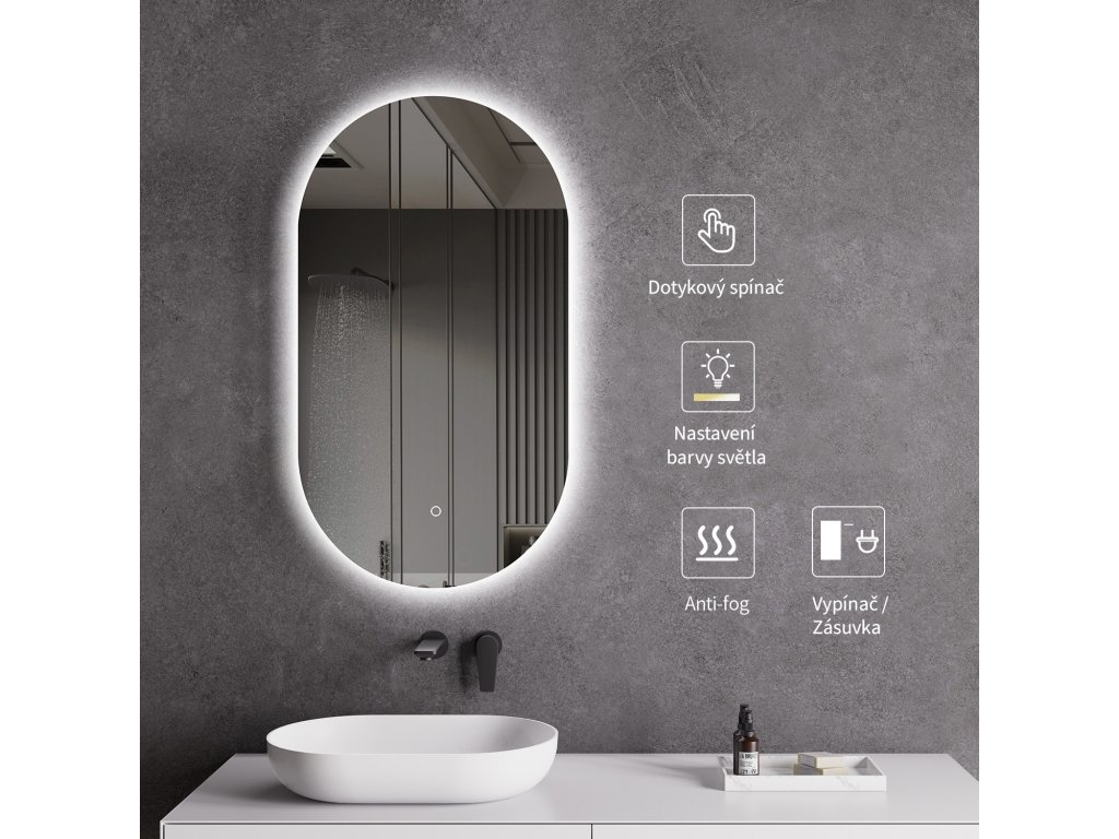 Lustro wyposażone jest w oświetlenie LED z regulowaną barwą światła – od 3000 K (ciepłe) do 6000 K (neutralne). Kolory można łatwo zmieniać za pomocą dotykowego przycisku na powierzchni lustra. Zapewnia ono intensywne i jasne światło do precyzyjnej pielęgnacji, a także przyjemne, delikatne oświetlenie sprzyjające relaksowi. Dzięki szerokiej gamie temperatur barwowych z łatwością dostosujesz nastrój do swoich aktualnych potrzeb.