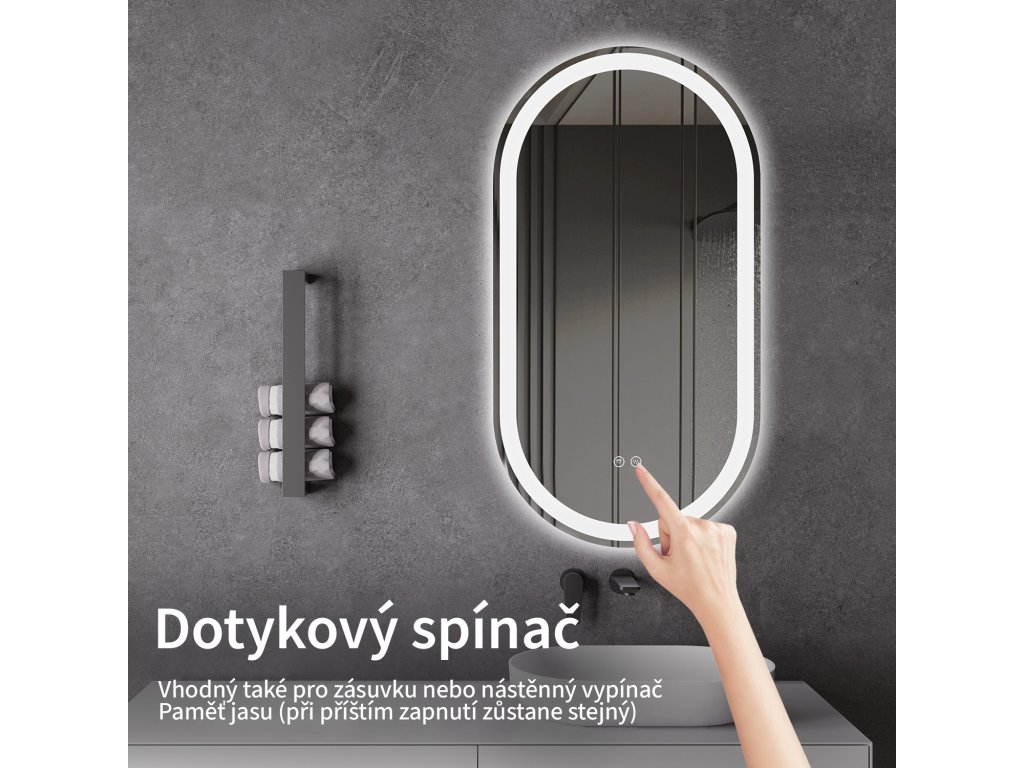 Lustra posiadają przycisk dotykowy, który włącza i wyłącza światło. Można je również podłączyć do klasycznego włącznika ściennego, ale nawet jeśli wyłączysz światło włącznikiem, po ponownym włączeniu musisz ponownie włączyć światło bezpośrednio na lustrze za pomocą przycisku dotykowego. Lustro jest gotowe do bezpośredniego podłączenia do sieci elektrycznej, ale można je również podłączyć do gniazdka za pomocą adaptera (brak w zestawie). Dla bezpiecznego montażu zalecamy kontakt z wykwalifikowanym elektrykiem.