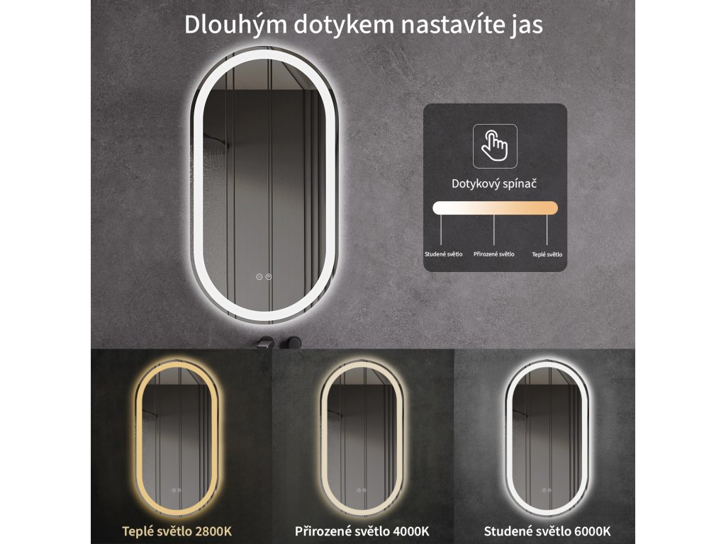 Lustro wyposażone jest w oświetlenie LED z regulowaną barwą światła – od 2800 K (ciepłe) do 6000 K (zimne). Zapewnia intensywne i jasne światło do precyzyjnej pielęgnacji, a także przyjemne i delikatne światło do relaksu. Dzięki szerokiej gamie temperatur barwowych możesz dostosować nastrój do swoich potrzeb.