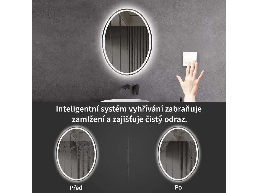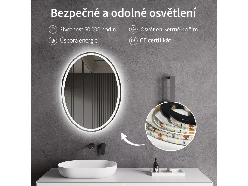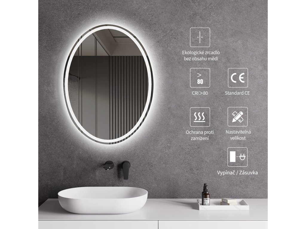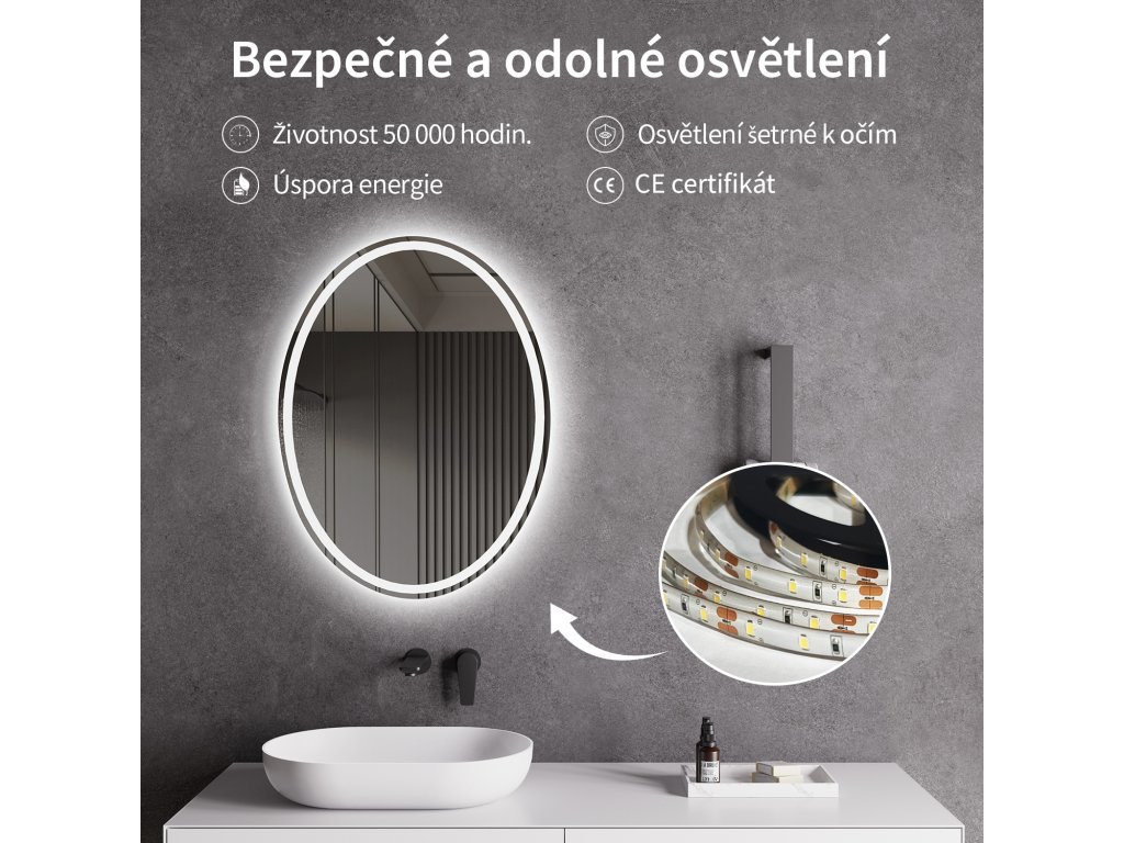 Lustro wyposażone jest w oświetlenie LED, które świeci zarówno w kierunku ściany od tyłu, jak i bezpośrednio do wnętrza poprzez jednolity pas świetlny w lustrze. Oświetlenie tylne tworzy delikatny efekt świetlny na obwodzie, a oświetlenie przednie zapewnia równomierne oświetlenie twarzy i przestrzeni przed lustrem. Oba elementy świetlne wzajemnie się uzupełniają, zapewniając równomierne i funkcjonalne oświetlenie łazienki.