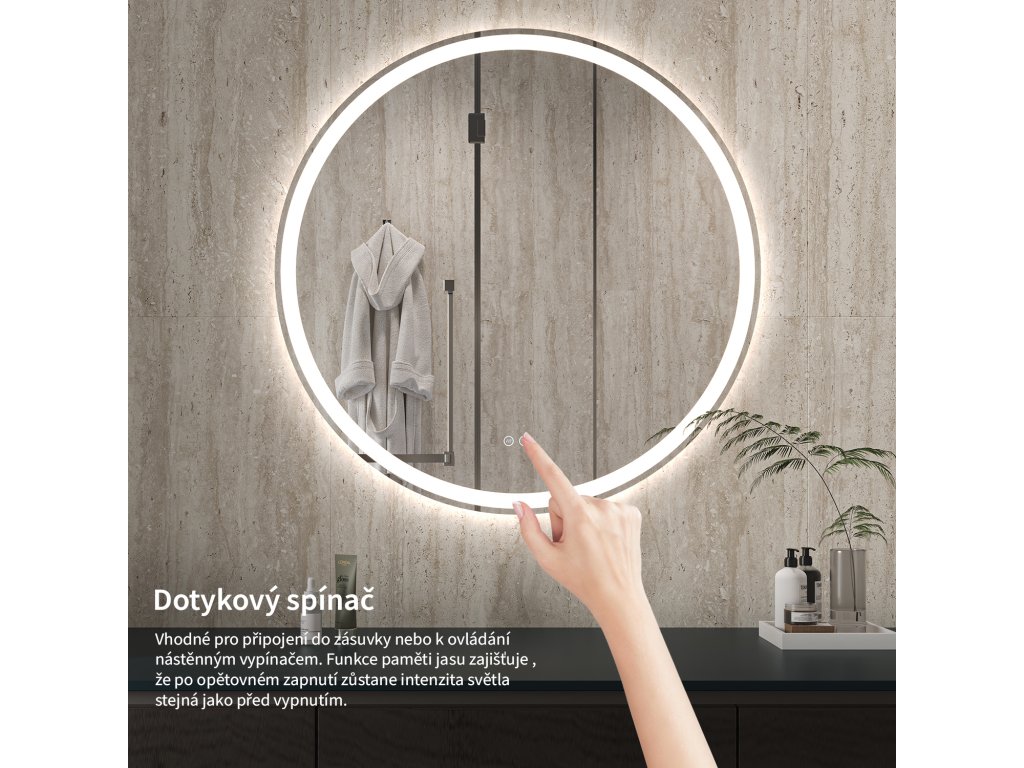 Lustra posiadają przycisk dotykowy, który włącza i wyłącza światło. Można je również podłączyć do klasycznego włącznika ściennego, ale nawet jeśli wyłączysz światło włącznikiem, po ponownym włączeniu musisz ponownie włączyć światło bezpośrednio na lustrze za pomocą przycisku dotykowego. Lustro jest gotowe do bezpośredniego podłączenia do sieci elektrycznej, ale można je również podłączyć do gniazdka za pomocą adaptera (brak w zestawie). Dla bezpiecznego montażu zalecamy kontakt z wykwalifikowanym elektrykiem.