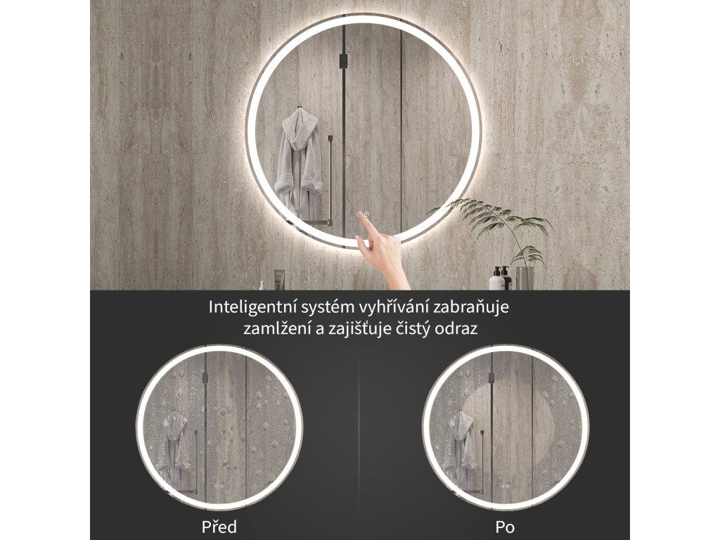 Lustro wyposażone jest w oświetlenie LED z regulowaną barwą światła – od 3000 K (ciepłe) do 6000 K (zimne). Kolory można łatwo zmieniać za pomocą dotykowego przycisku na powierzchni lustra. Zapewnia intensywne i jasne światło do precyzyjnej pielęgnacji, a także przyjemne, delikatne oświetlenie do relaksu. Dzięki szerokiej gamie temperatur barwowych z łatwością dostosujesz nastrój do swoich aktualnych potrzeb.