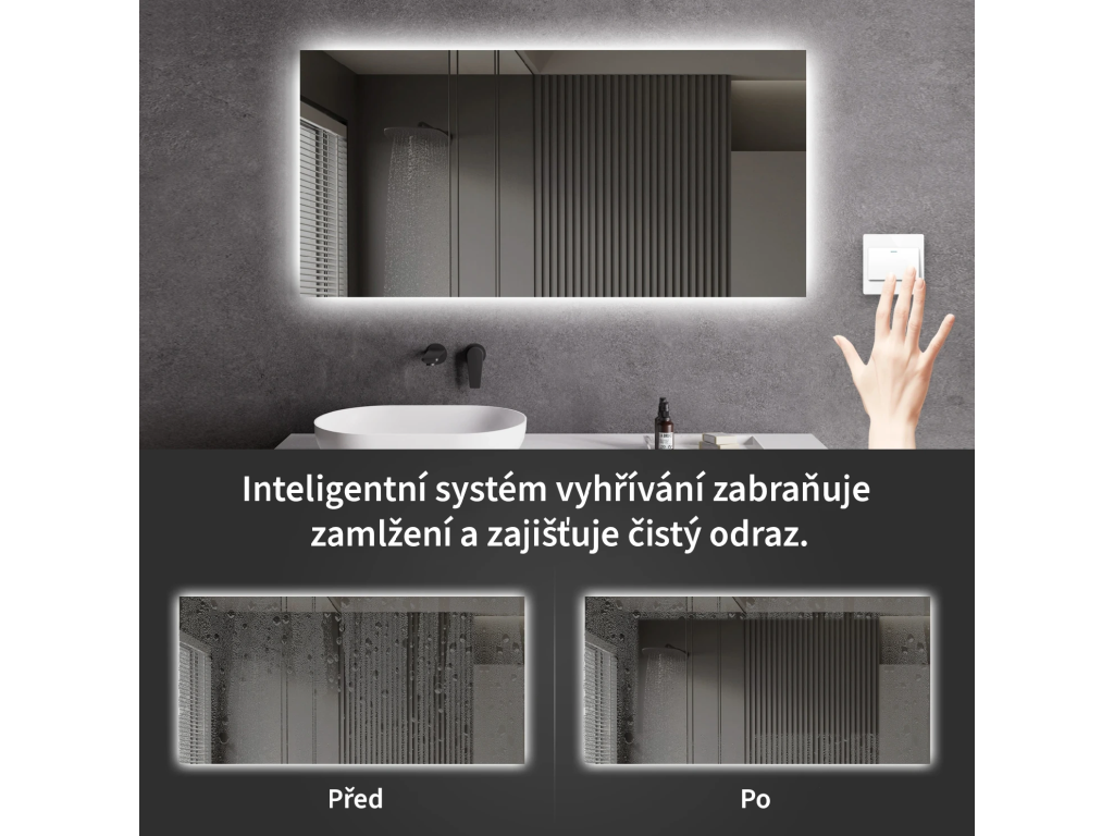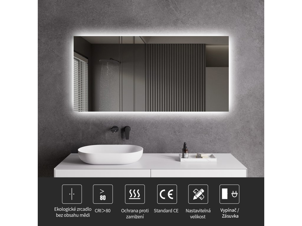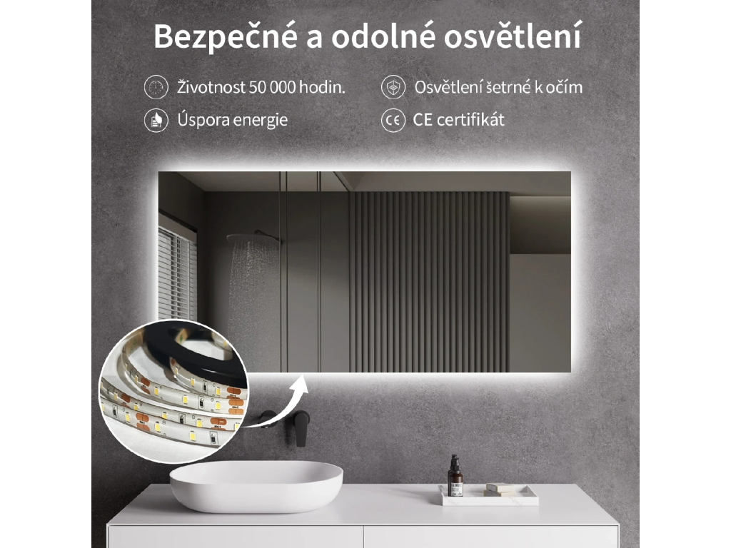 Lustro wyposażone jest w tylne podświetlenie LED, które pada na ścianę i tworzy delikatny efekt świetlny na całym obwodzie. Rozproszone światło emitowane jest z przestrzeni między ramą a lustrem, nie oślepia i zapewnia równomierne, przyjemne oświetlenie łazienki.