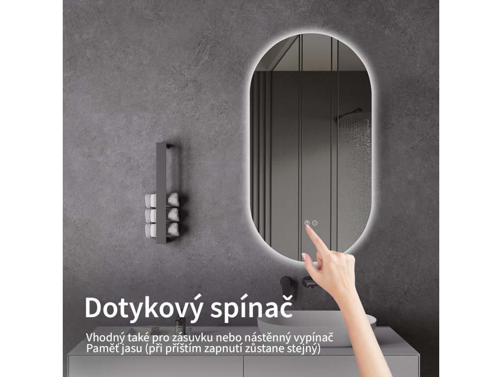 Oświetlenie lustra można łatwo i wygodnie włączyć, dotykając włącznika na panelu lustra. Pozwala to na szybką regulację oświetlenia bez konieczności sięgania po bardziej oddalony, tradycyjny włącznik.