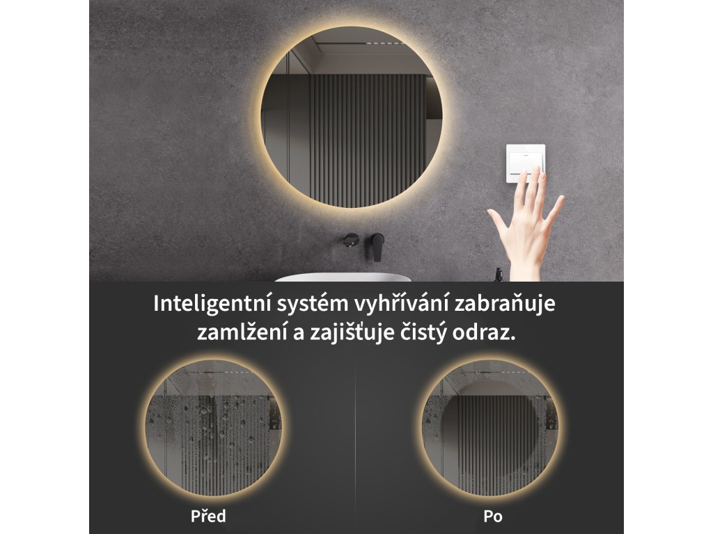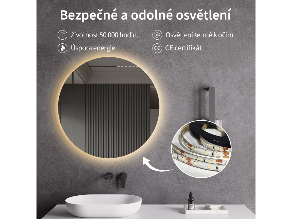 Lustro wyposażone jest w oświetlenie LED o ciepłej barwie – 3000-3500 K. Zapewnia ono przyjemne i miękkie światło, tworząc ciepłą atmosferę. Idealne do relaksu i komfortowej codziennej pielęgnacji, gdy potrzebne jest naturalne, nieoślepiające światło.
