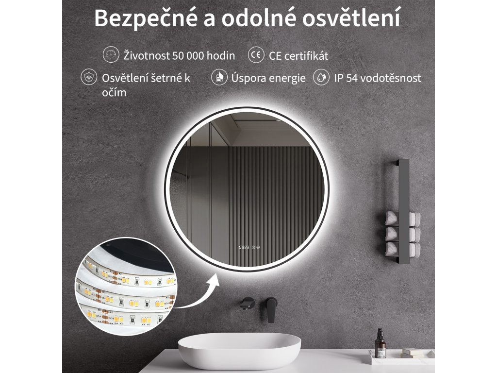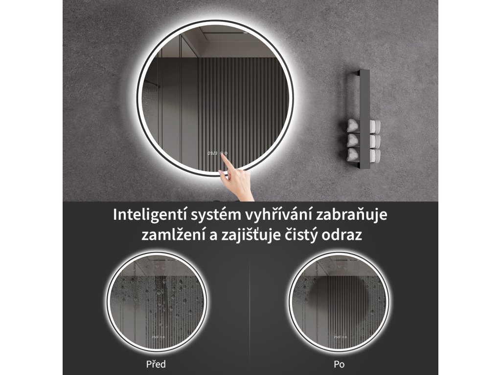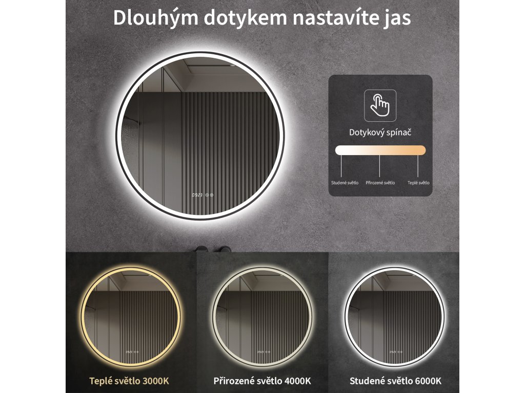 Lustro wyposażone jest w oświetlenie LED z regulowaną barwą światła – od 3000 K (ciepłe) do 6000 K (zimne). Kolory można łatwo zmieniać za pomocą dotykowego przycisku na powierzchni lustra. Zapewnia intensywne i jasne światło do precyzyjnej pielęgnacji, a także przyjemne, delikatne oświetlenie do relaksu. Dzięki szerokiej gamie temperatur barwowych z łatwością dostosujesz nastrój do swoich aktualnych potrzeb.