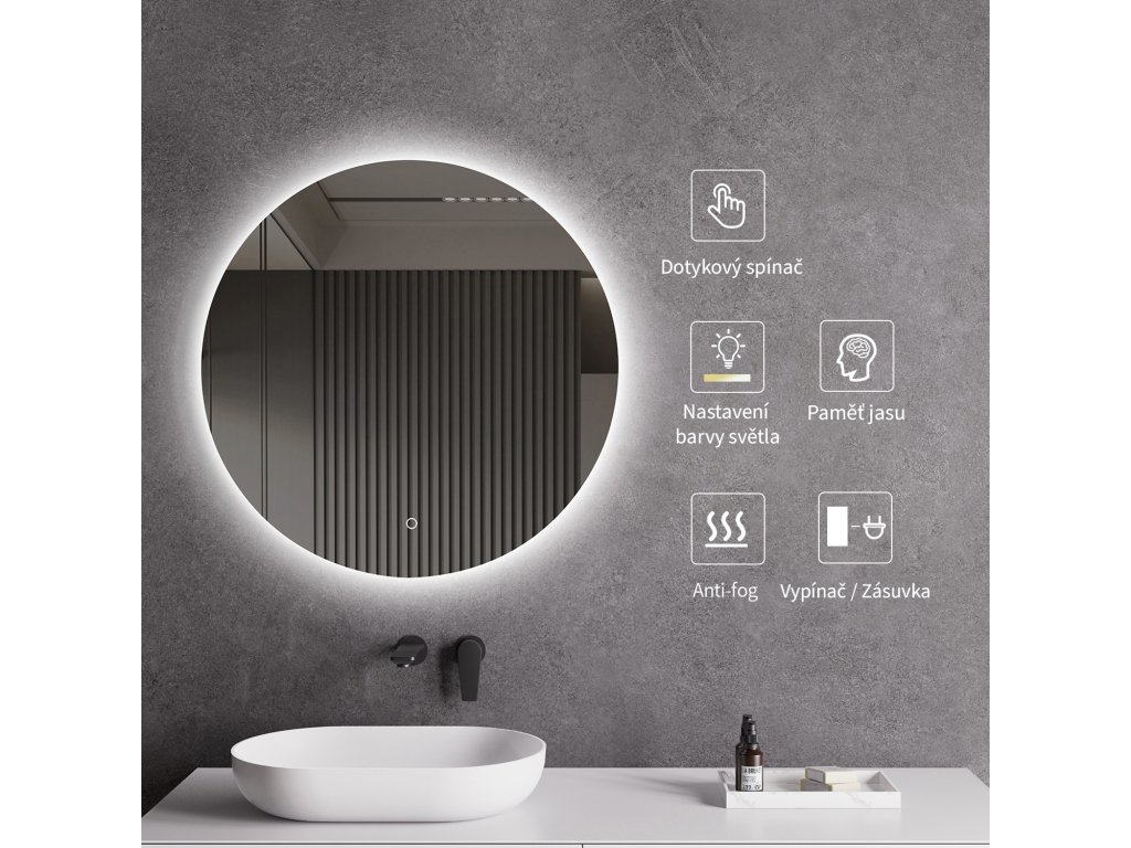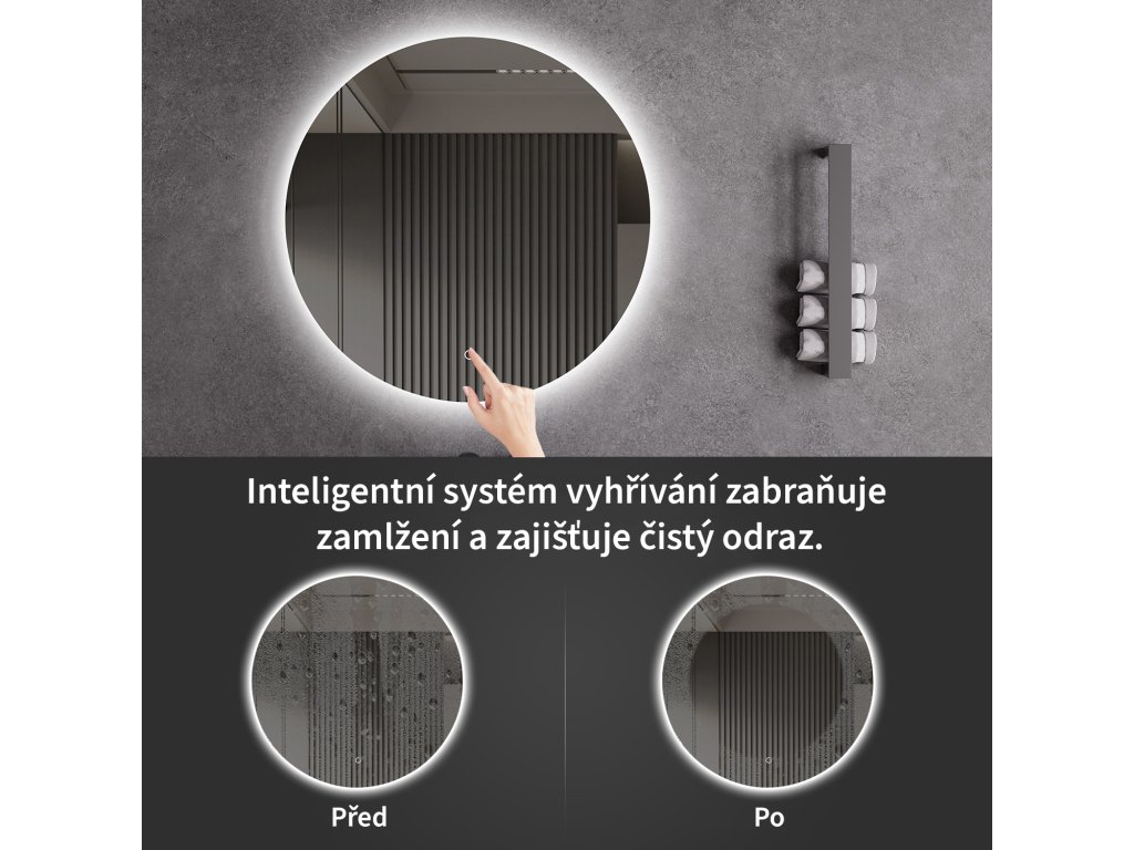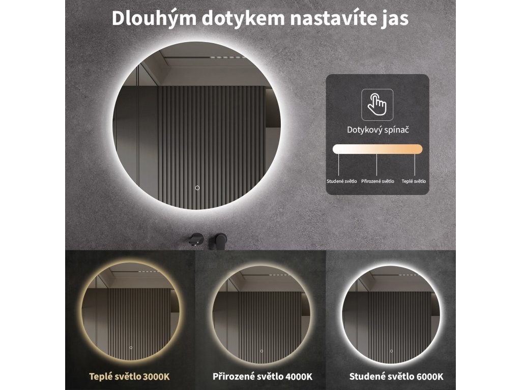 Lustro wyposażone jest w oświetlenie LED z regulowaną barwą światła – od 3000 K (ciepłe) do 6000 K (zimne). Kolory można łatwo zmieniać za pomocą dotykowego przycisku na powierzchni lustra. Zapewnia intensywne i jasne światło do precyzyjnej pielęgnacji, a także przyjemne, delikatne oświetlenie do relaksu. Dzięki szerokiej gamie temperatur barwowych z łatwością dostosujesz nastrój do swoich aktualnych potrzeb.