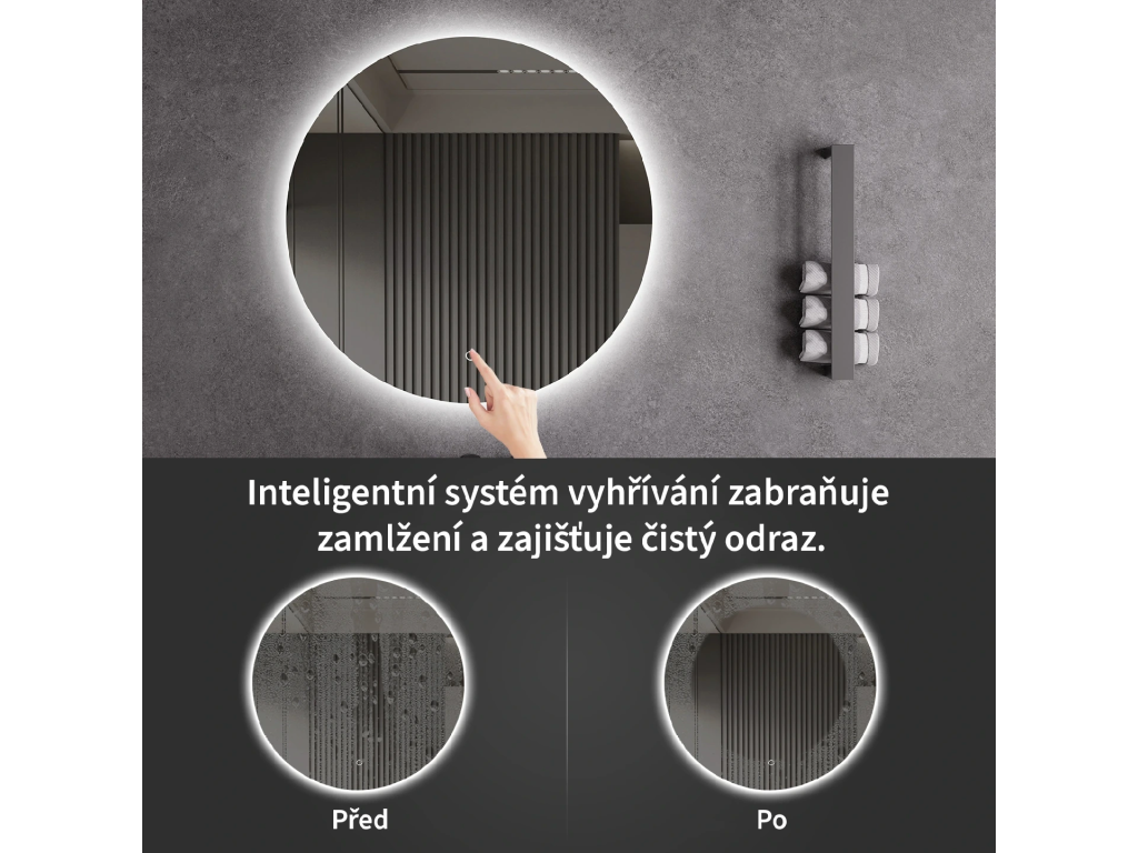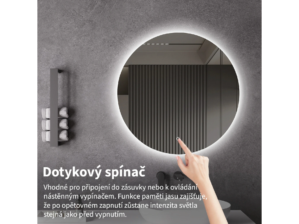 Lustro wyposażone jest w oświetlenie LED z regulowaną barwą światła – od 3000 K (ciepłe) do 6000 K (neutralne). Kolory można łatwo zmieniać za pomocą dotykowego przycisku na powierzchni lustra. Zapewnia ono intensywne i jasne światło do precyzyjnej pielęgnacji, a także przyjemne, delikatne oświetlenie sprzyjające relaksowi. Dzięki szerokiej gamie temperatur barwowych z łatwością dostosujesz nastrój do swoich aktualnych potrzeb.