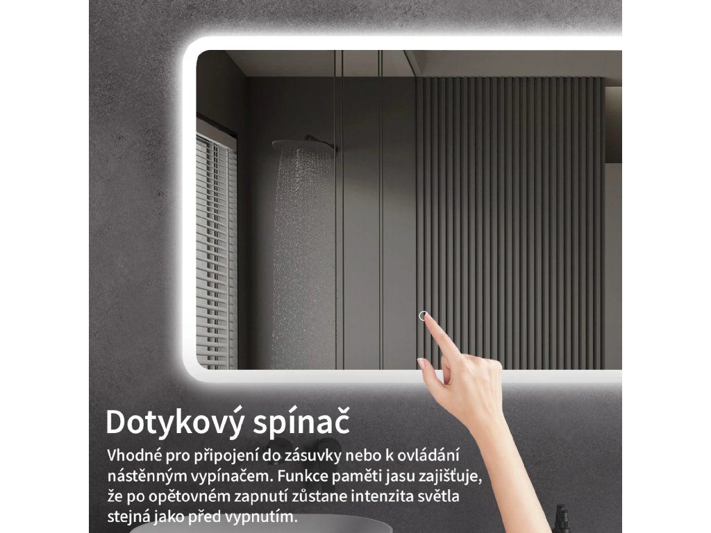 Oświetlenie lustra można łatwo i wygodnie włączyć, dotykając włącznika na panelu lustra. Pozwala to na szybką regulację oświetlenia bez konieczności sięgania po bardziej oddalony, tradycyjny włącznik.