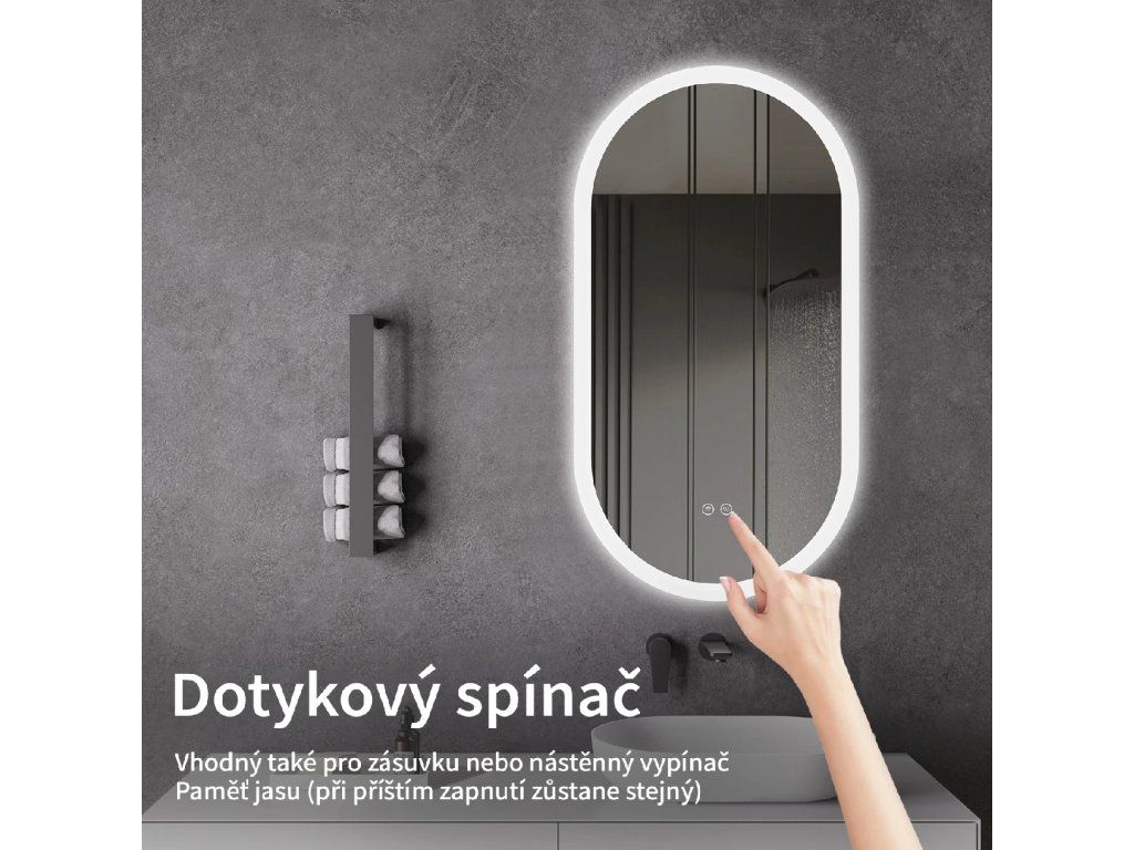 Oświetlenie lustra można łatwo i wygodnie włączyć, dotykając włącznika na panelu lustra. Pozwala to na szybką regulację oświetlenia bez konieczności sięgania po bardziej oddalony, tradycyjny włącznik.