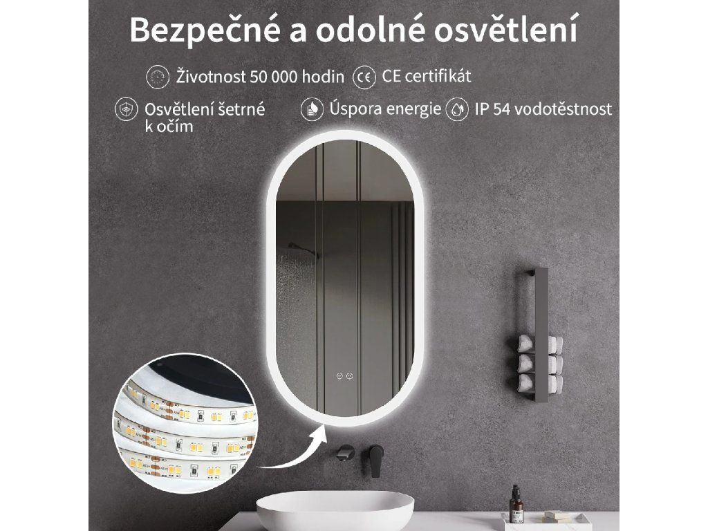 Lustro wyposażone jest w oświetlenie LED z regulowaną barwą światła – od 2800 K (ciepłe) do 6000 K (neutralne). Zapewnia intensywne i jasne światło do precyzyjnej pielęgnacji, a także przyjemne i miękkie światło do relaksu. Dzięki szerokiej gamie temperatur barwowych możesz dostosować nastrój do swoich potrzeb.
