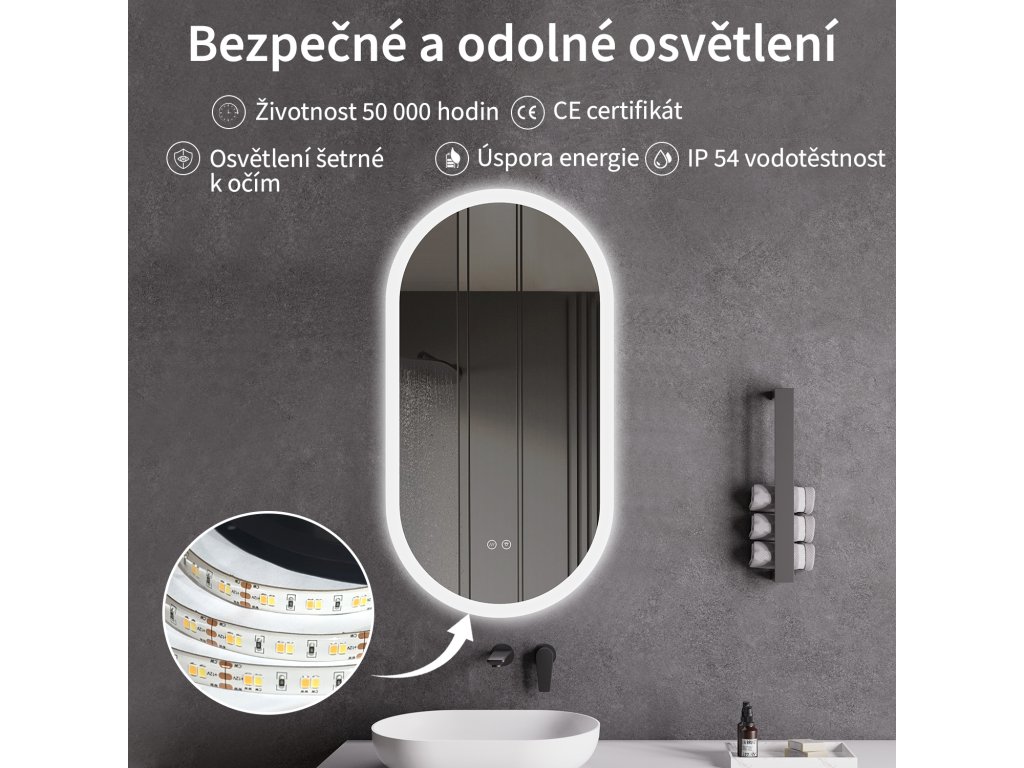 Lustro wyposażone jest w oświetlenie LED, które świeci zarówno w kierunku ściany od tyłu, jak i bezpośrednio do wnętrza poprzez jednolity pas świetlny w lustrze. Oświetlenie tylne tworzy delikatny efekt świetlny na obwodzie, a oświetlenie przednie zapewnia równomierne oświetlenie twarzy i przestrzeni przed lustrem. Oba elementy świetlne wzajemnie się uzupełniają, zapewniając równomierne i funkcjonalne oświetlenie łazienki.