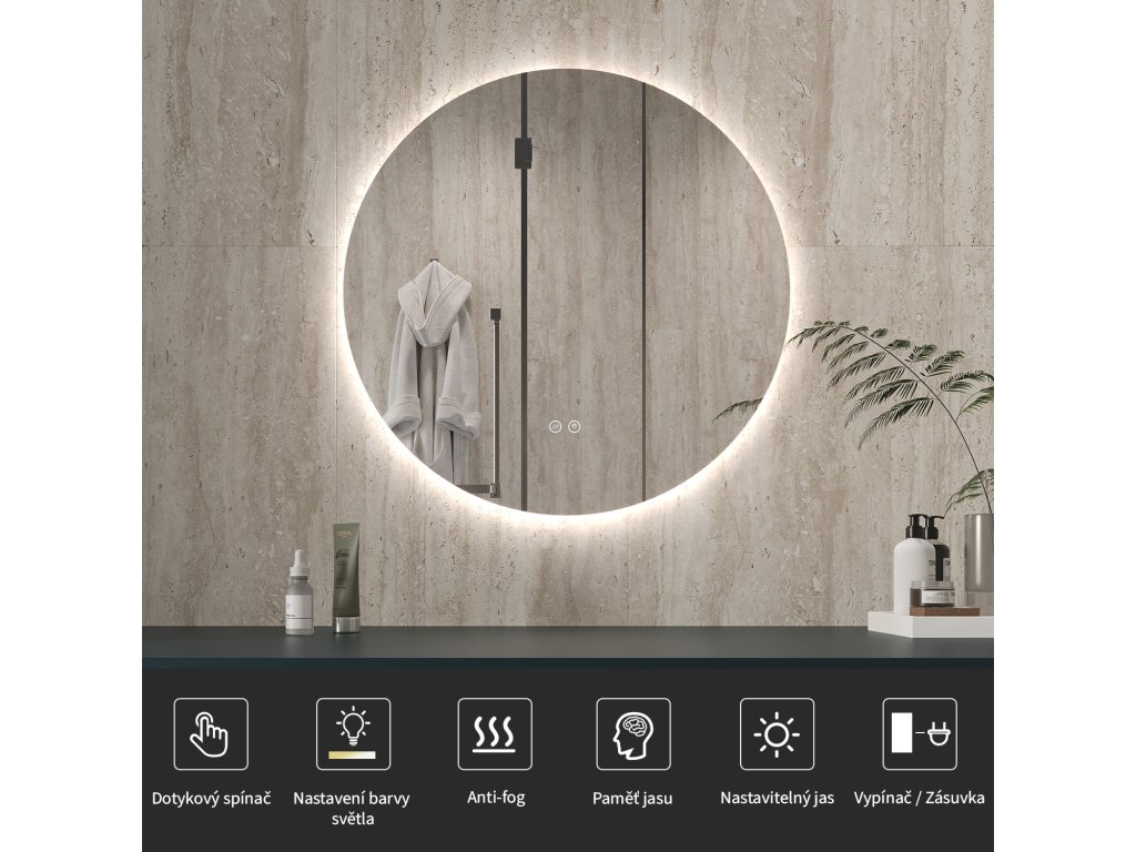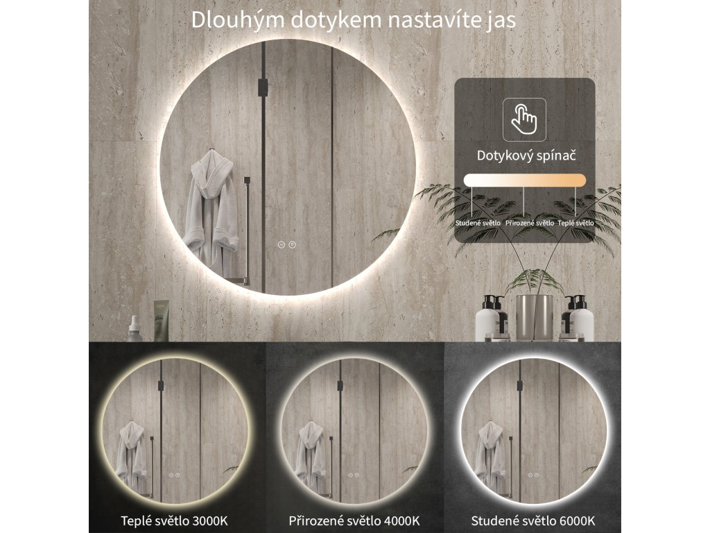 Lustro wyposażone jest w oświetlenie LED z regulowaną barwą światła – od 3000 K (ciepłe) do 6000 K (zimne). Kolory można łatwo zmieniać za pomocą dotykowego przycisku na powierzchni lustra. Zapewnia intensywne i jasne światło do precyzyjnej pielęgnacji, a także przyjemne, delikatne oświetlenie do relaksu. Dzięki szerokiej gamie temperatur barwowych z łatwością dostosujesz nastrój do swoich aktualnych potrzeb.