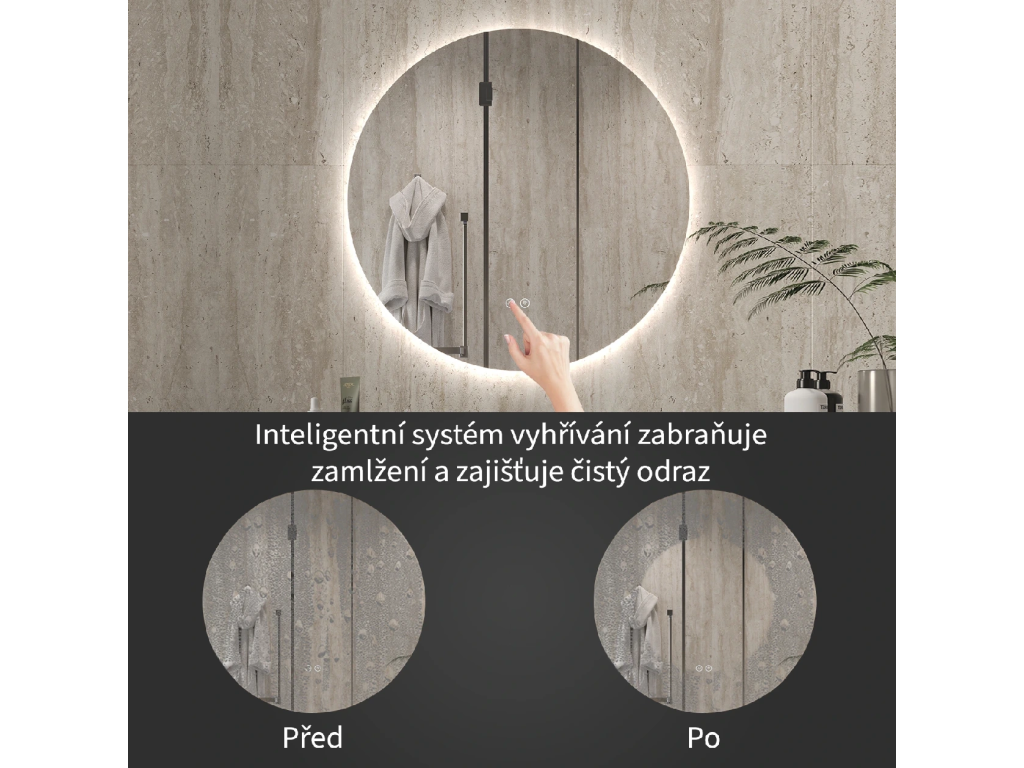 Lustro wyposażone jest w oświetlenie LED z regulowaną barwą światła – od 3000 K (ciepłe) do 6000 K (neutralne). Kolory można łatwo zmieniać za pomocą dotykowego przycisku na powierzchni lustra. Zapewnia ono intensywne i jasne światło do precyzyjnej pielęgnacji, a także przyjemne, delikatne oświetlenie sprzyjające relaksowi. Dzięki szerokiej gamie temperatur barwowych z łatwością dostosujesz nastrój do swoich aktualnych potrzeb.