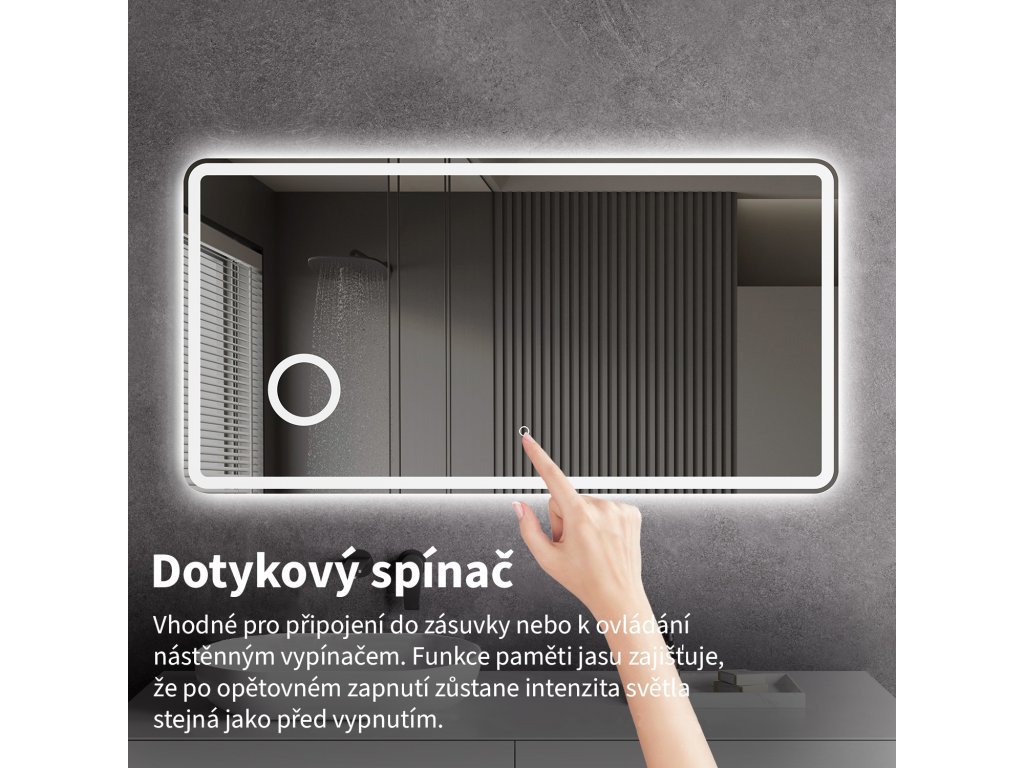 Lustro LED posiada ściemniacz, który pozwala precyzyjnie regulować natężenie światła. Wystarczy dotknąć pola czujnika, aby włączyć lub wyłączyć światło. Przytrzymaj palec, aby dostosować jasność w razie potrzeby – światło płynnie zwiększa lub zmniejsza natężenie, zapewniając zawsze idealne oświetlenie, dokładnie dopasowane do Twoich potrzeb.