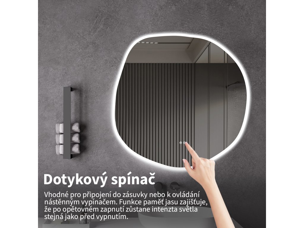 Lustra posiadają przycisk dotykowy, który włącza i wyłącza światło. Można je również podłączyć do klasycznego włącznika ściennego, ale nawet jeśli wyłączysz światło włącznikiem, po ponownym włączeniu musisz ponownie włączyć światło bezpośrednio na lustrze za pomocą przycisku dotykowego. Lustro jest gotowe do bezpośredniego podłączenia do sieci elektrycznej, ale można je również podłączyć do gniazdka za pomocą adaptera (brak w zestawie). Dla bezpiecznego montażu zalecamy kontakt z wykwalifikowanym elektrykiem.