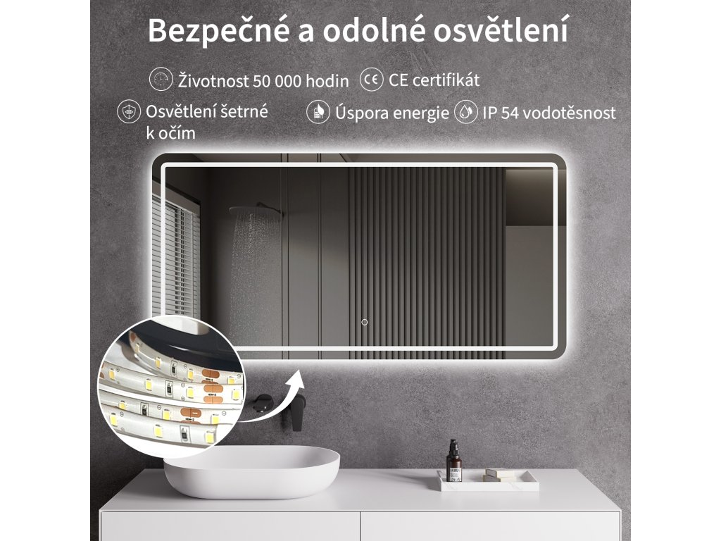 Lustro LED posiada ściemniacz, który pozwala precyzyjnie regulować natężenie światła. Wystarczy dotknąć pola czujnika, aby włączyć lub wyłączyć światło. Przytrzymaj palec, aby dostosować jasność do swoich potrzeb – światło stopniowo zwiększa się lub zmniejsza, aby zawsze zapewnić idealne oświetlenie, dokładnie dopasowane do Twoich potrzeb.