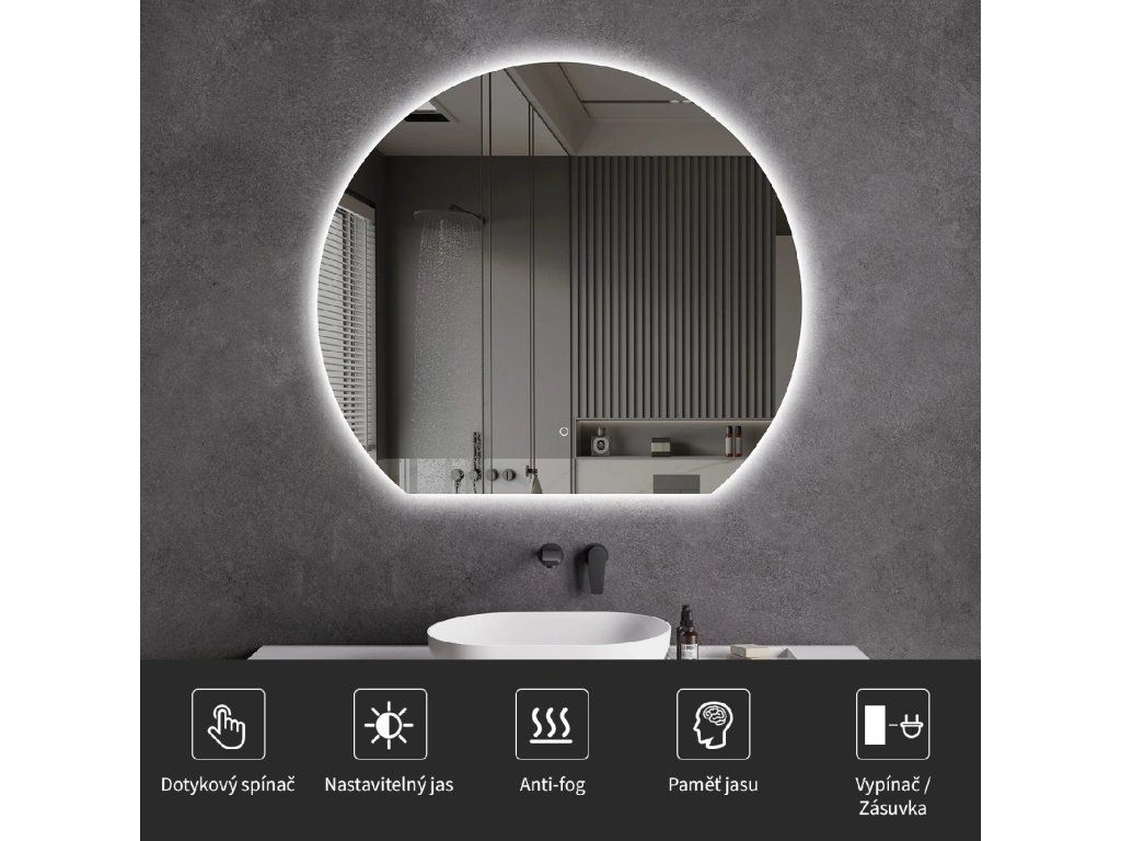 Lustra posiadają przycisk dotykowy, który włącza i wyłącza światło. Można je również podłączyć do klasycznego włącznika ściennego, ale nawet jeśli wyłączysz światło włącznikiem, po ponownym włączeniu musisz ponownie włączyć światło bezpośrednio na lustrze za pomocą przycisku dotykowego. Lustro jest gotowe do bezpośredniego podłączenia do sieci elektrycznej, ale można je również podłączyć do gniazdka za pomocą adaptera (brak w zestawie). Dla bezpiecznego montażu zalecamy kontakt z wykwalifikowanym elektrykiem.