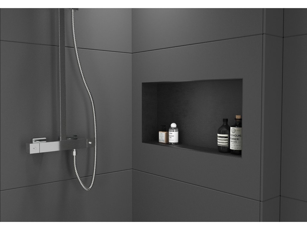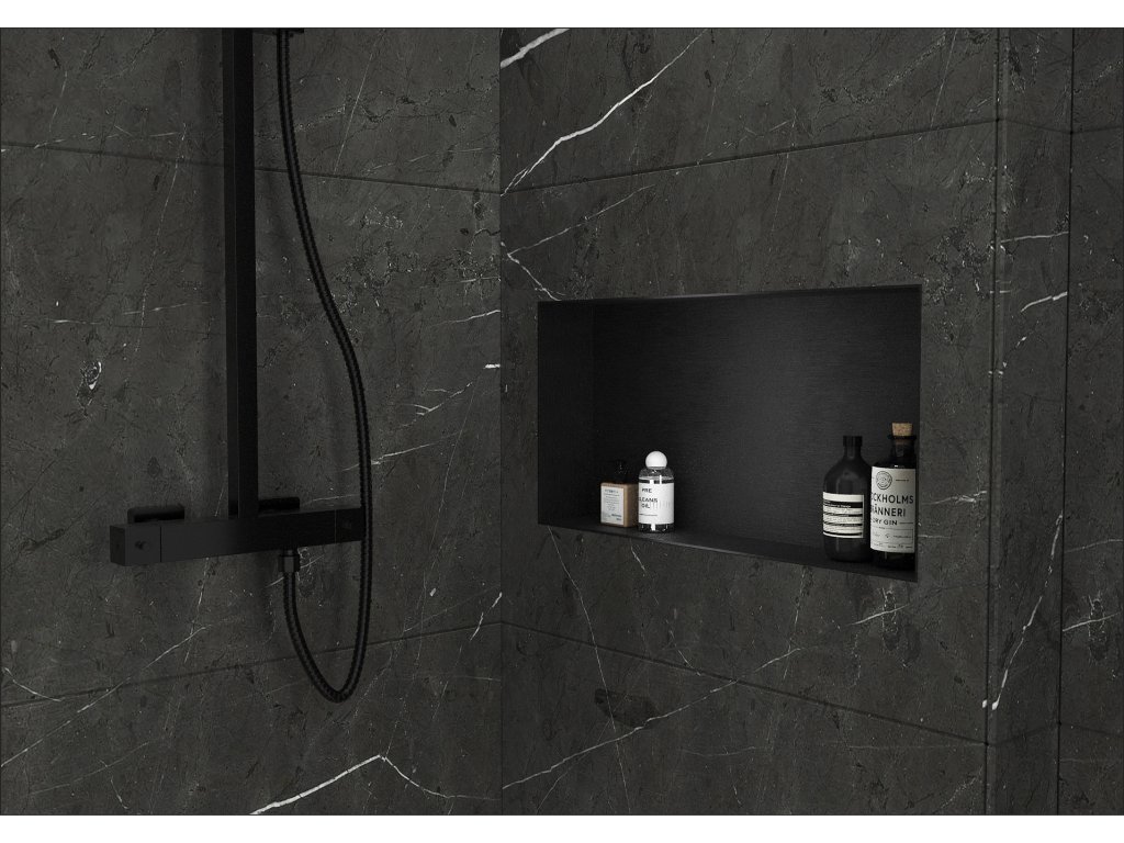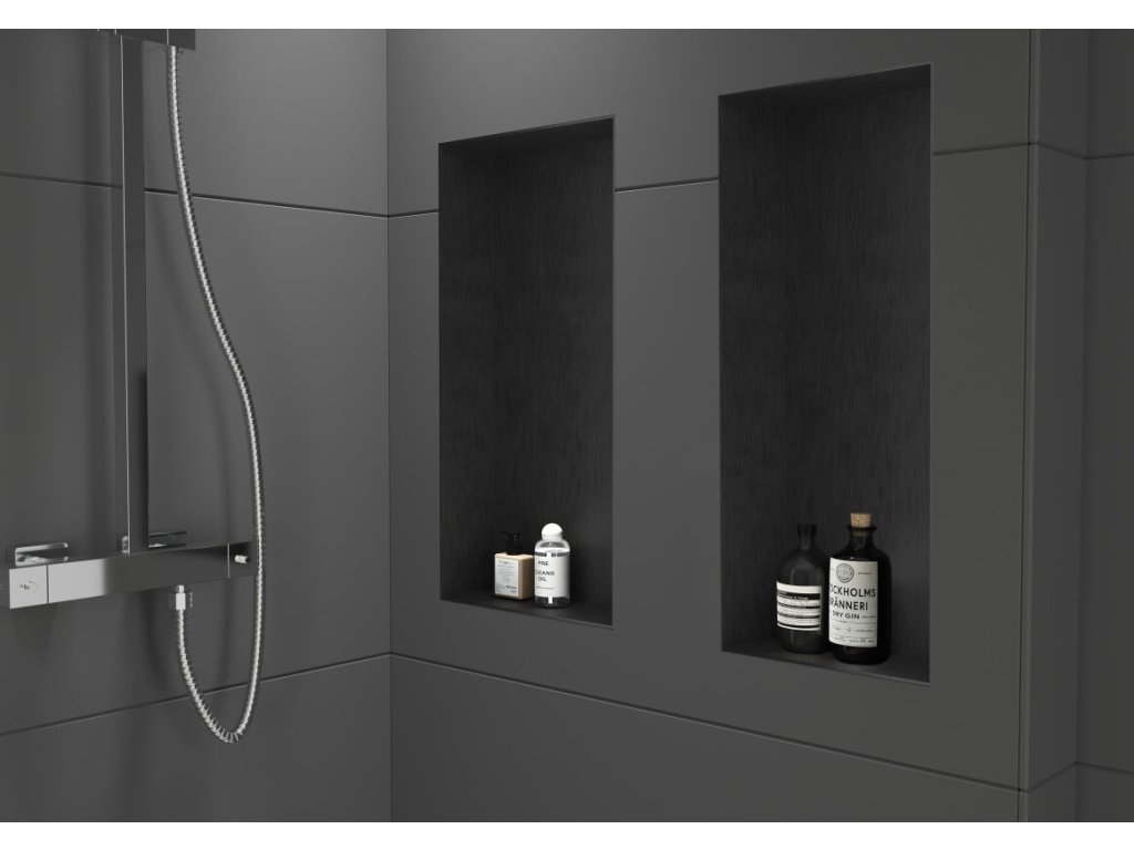 Półki można łatwo zamontować w większości ścian lub wnęk i stanowią idealne uzupełnienie kabin prysznicowych, rozwiązując problem z przechowywaniem. Ich kołnierz nie tylko stanowi element dekoracyjny, ale także zakrywa krawędzie płytek i tworzy elegancką ramę.