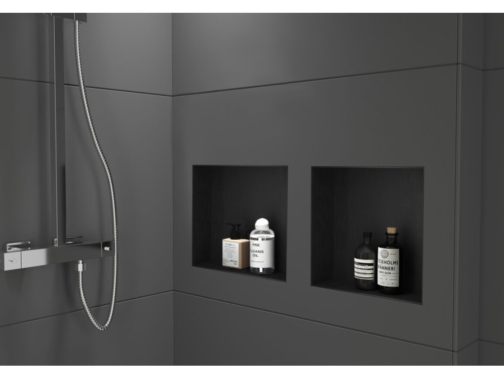 Półki można łatwo zamontować w większości ścian lub wnęk i stanowią idealne uzupełnienie kabin prysznicowych, rozwiązując problem z przechowywaniem. Ich kołnierz nie tylko stanowi element dekoracyjny, ale także zakrywa krawędzie płytek i tworzy elegancką ramę.