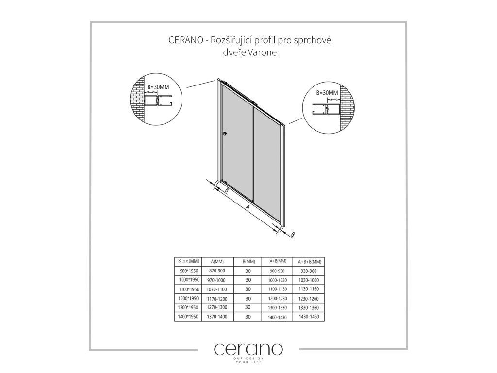 Profil rozszerzający Cerano został zaprojektowany tak, aby z łatwością dopasować drzwi prysznicowe VARONE do szerszych otworów w budynku .