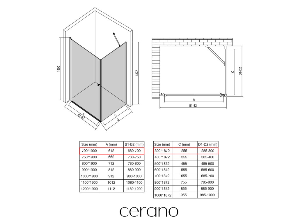 W ramach tej serii oferujemy szeroki wybór wymiarów, aby sprostać zróżnicowanym potrzebom naszych klientów. Wszystkie kabiny prysznicowe, drzwi i parawany CERANO są w pełni kompatybilne z brodzikami CERANO o tych samych wymiarach, co zapewnia bezproblemowy montaż i idealną koordynację.
