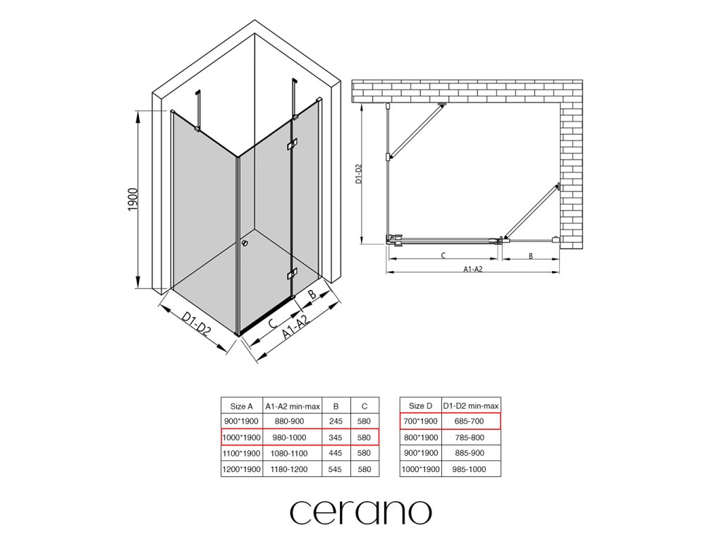 W ramach tej serii oferujemy szeroki wybór wymiarów, aby sprostać zróżnicowanym potrzebom naszych klientów. Wszystkie kabiny prysznicowe, drzwi i parawany CERANO są w pełni kompatybilne z brodzikami CERANO o tych samych wymiarach, co zapewnia bezproblemowy montaż i idealne dopasowanie. Ponadto kabinę można elastycznie zamontować – na pasującym brodziku lub bezpośrednio na podłodze, w zależności od preferencji i wyposażenia łazienki.