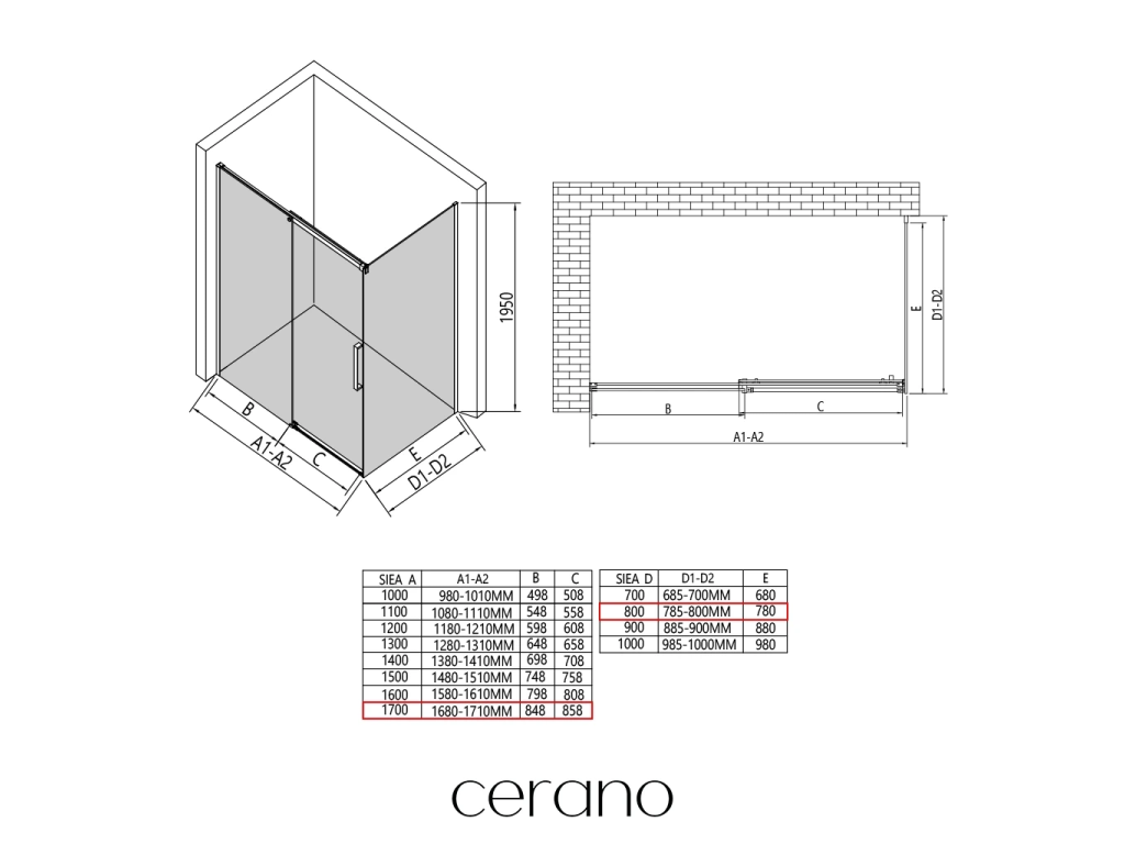 W ramach tej serii oferujemy szeroki wybór wymiarów, aby sprostać zróżnicowanym potrzebom naszych klientów. Wszystkie kabiny prysznicowe, drzwi i parawany CERANO są w pełni kompatybilne z brodzikami CERANO o tych samych wymiarach, co zapewnia bezproblemowy montaż i idealne dopasowanie. Ponadto kabinę można elastycznie zamontować – na pasującym brodziku lub bezpośrednio na podłodze, w zależności od preferencji i wyposażenia łazienki.
