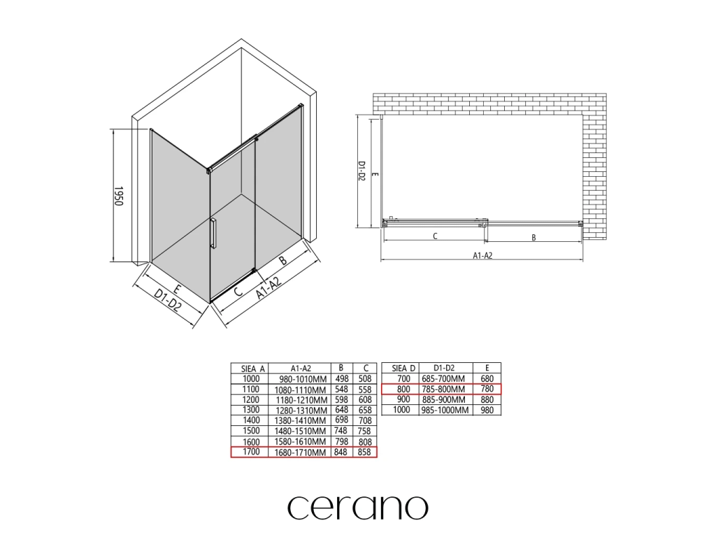 W ramach tej serii oferujemy szeroki wybór wymiarów, aby sprostać zróżnicowanym potrzebom naszych klientów. Wszystkie kabiny prysznicowe, drzwi i parawany CERANO są w pełni kompatybilne z brodzikami CERANO o tych samych wymiarach, co zapewnia bezproblemowy montaż i idealne dopasowanie. Ponadto kabinę można elastycznie zamontować – na pasującym brodziku lub bezpośrednio na podłodze, w zależności od preferencji i wyposażenia łazienki.