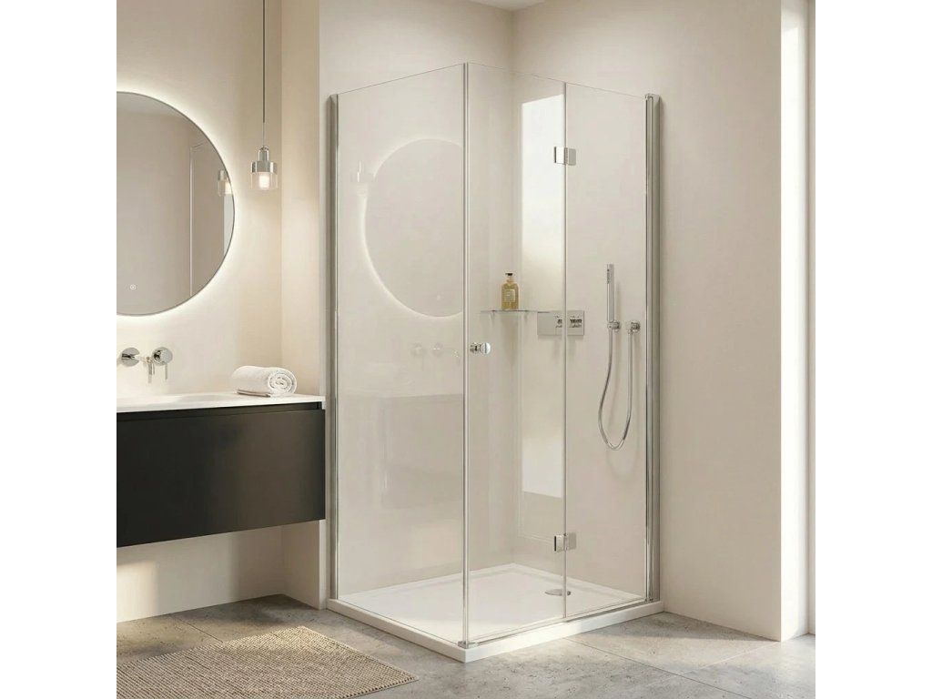 Drzwi posiadają składany system otwierania, idealny do mniejszych łazienek z ograniczoną przestrzenią przed prysznicem. Drzwi są zawieszone na wpuszczanych zawiasach z pneumatycznym systemem podnoszenia.