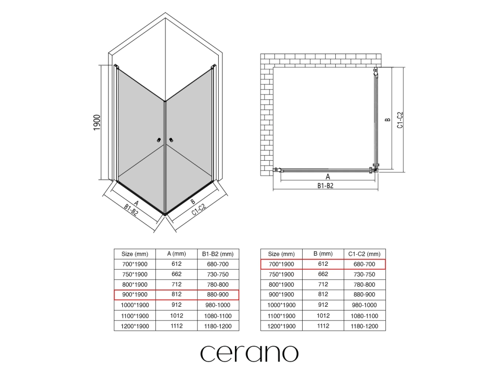 W ramach tej serii oferujemy szeroki wybór wymiarów, aby sprostać zróżnicowanym potrzebom naszych klientów. Wszystkie kabiny prysznicowe, drzwi i parawany CERANO są w pełni kompatybilne z brodzikami CERANO o tych samych wymiarach, co zapewnia bezproblemowy montaż i idealną koordynację.